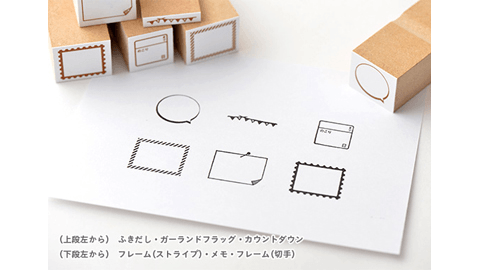 手帳と一緒に使いやすいスタンプを多数取り扱っている「OSANPO shopping」と一緒に作ったほぼ日手帳のサイズにぴったりのオリジナルスタンプです。「フレーム(切手・ストライプ)」「ふきだし」「メモ」は、ほぼ日手帳オリジナルの月間スケジュールのマスにちょうど合うサイズのスタンプ。大事な日のマスを目立たせることができます。(また「メモ」以外のスタンプは、縦に使うと、WEEKSの月間スケジュールのマス目にもぴったり合います)「カウントダウン」は、楽しみなイベントや大事な試験までの日数をカウントできるスタンプ。三角旗の並ぶ「ガーランドフラッグ」は、マス目を飾りたいときにも、ページの区切り線としても使えます。