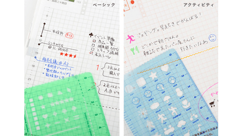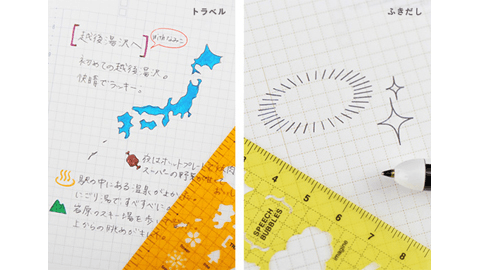 定番の「ベーシック」は、TODOリスト作成に便利な四角マークや、星、ハート、数字などを集めたもの。「アクティビティ」は、乗り物や天気を記録するマークや、愛嬌のある顔マークがかわいいテンプレート。「トラベル」は日本地図や、温泉や花火など、旅や遊びの記録に役立ちそうなものを揃えました。「ふきだし」は、手帳と相性のいいふきだしをバリエーション豊かに描くことができます。
