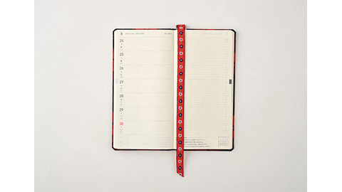 ほぼ日手帳WEEKSの後ろ見返し(手帳の裏表紙と本体をつなげている厚い紙)に、クリップで固定して使う、リボンのしおりです。ぱっと目をひく、遊び心のあるデザインはWEEKSに装着したときの様子もかわいいです。3本目のしおりとしてご活用ください。