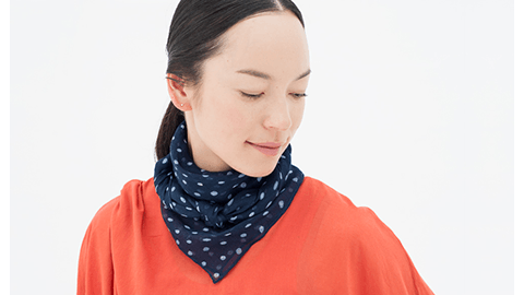 クラシックだけれど、あたらしい。そよそよ吹く風に、ふわりと舞いあがるくらいのかるさ。そして、光をきれいにとおす、透け感。うんと薄い麻の織物をつかって織りました。水彩で、1点ずつ手描きした「みずたま」をもとにしたプリントも、じつはとても高度なわざ。水彩ならではの滲(にじ)みや濃淡をいかすため、手捺染という、シルクスクリーンのような技法で、みずたま部分だけで2版を使ってプリントし、さらに紺地を1版重ねています。ちなみに「リュシオル」は、フランス語で「蛍」の意味。