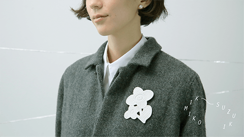 陶芸の量産技術である型と手仕事を組み合わせたシリーズ。無釉でマットな質感が特長です。裏面に釉薬をかけることで強度を増しています。ふたつの花が寄り添っているデザインで、秋冬の厚手のニットやアウターにつけても似合うよう、大きめにつくっています。裏面は限定色のピンクです。