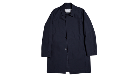ベーシックなタイプの一見、なんの変哲もないステンカラーコートですが、細身のI(アイ)ラインシルエットに仕上げているため、すっきり、洗練された印象で着ていただけます。ボタンは「CINÉ & TRAVEL」の刻印入りのスペシャル仕様。色は、黒にも見えそうな、かなり濃い紺色です。