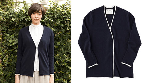 気がるにさっとはおれる、カシミア100%のカーディガンです。編み地をもうすこし厚いものに。さらに前立て部分と袖口に、アイボリーのパイピングをあしらいました。ごくシンプルなデザインですが、きちんとした、清潔感があるのが特長です。色はミディアムグレーとネイビー、使いやすい2色を用意しました。シーンをえらばず着ていただけるカシミアです。