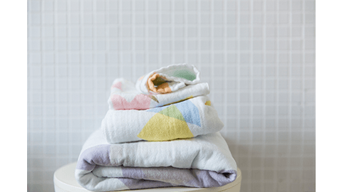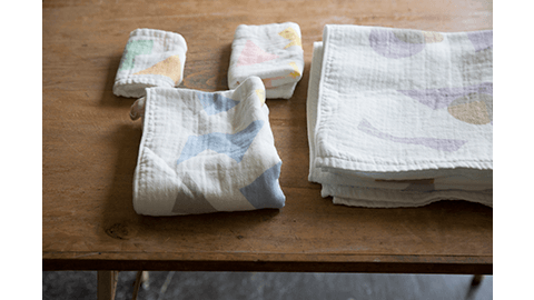 - 片面ガーゼ、片面パイルの二重織りのため、両面パイルのタオルの「厚さ」や「重さ」とは質感が異なります。