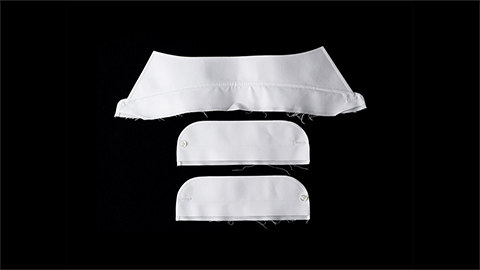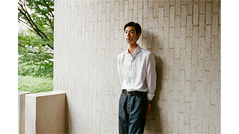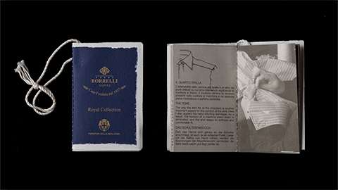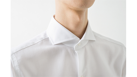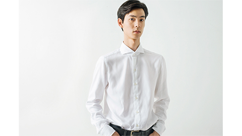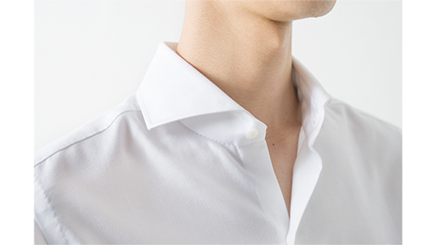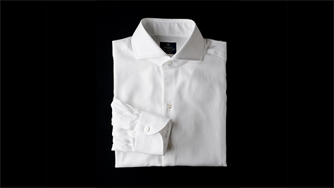 “カッタウェイ”(cut away)は、ぐっと横に開かれたようなかたちの襟。ネクタイを締めないひとがふえてきたなか、襟先の羽が横に開いているカッタウェイは、鎖骨のところでうまく留まってくれ、襟の開きがひじょうに美しく見えます。もちろんネクタイを締めても、格好よくきまります。このカッタウェイシャツの素材には、「オックスフォード」をえらびました。といっても、粗い印象のカジュアルなものではなく、海島綿とスーピマ綿の交配種であるマスターシードコットンの糸を細くつむぎ、やわらかく織っていますから、とてもソフトな感触。ちなみに、生地をつくる工程は、日本国内でおこなっています。それをイタリアに送り、ボレッリ社が縫製。かたちは、まったくのイタリア仕様ではなく、メンズのシャツはフィット感が大切であると、日本人の体型に合うスタイルを採用しています。
