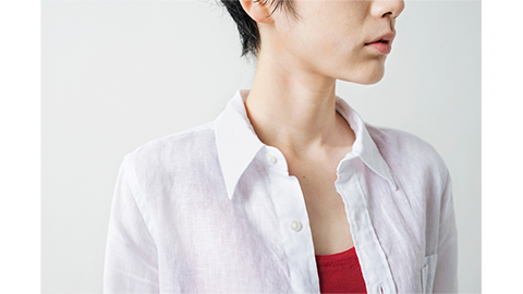リネンのシンプルなシャツのいいところは、洗って、そのまま伸ばさずに乾かせば、アイロンをまったくかけずに着ていただけること。「らくちん」で「おしゃれ」です。もちろんこのシャツも「くしゅくしゅっ」と着て、様になる。カジュアルなのに、ふわっと香りたつような品があります。しかも、後ろのラインのウエストがきれいにシェイプされたパターンなので、「飾らないのに、女性らしい」印象が出ます。前ボタンをすべてとめてもいいですし、ひとつ、あるいはふたつ開けてもかっこいい。襟を立てて着るのもいいでしょうし、透け感をいかして、重ね着として、前ボタンをすべて開けて羽織るように着ても、いいですよね。