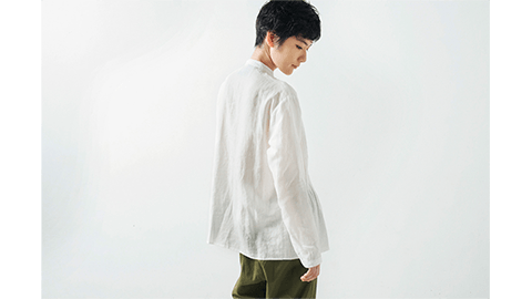 髙品質なリネンの織り地、スタンドカラーの襟、前身ごろにこまかなピンタック、裾にはゆったりしたドレープ。着ると、腰のあたりに自然な「くびれ」がうまれる。まるでヨーロッパの(それも、フランスやイタリアの)アンティークのような雰囲気をもったドレスシャツです。今回のラインナップのなかで、とりわけ個性的で、女性らしい1枚かもしれません。最初、触ると、すこしだけ硬さを感じるかもしれませんが、着て、洗って、乾かして、それをくりかえしていくうちに、どんどんしなやかになっていきます。