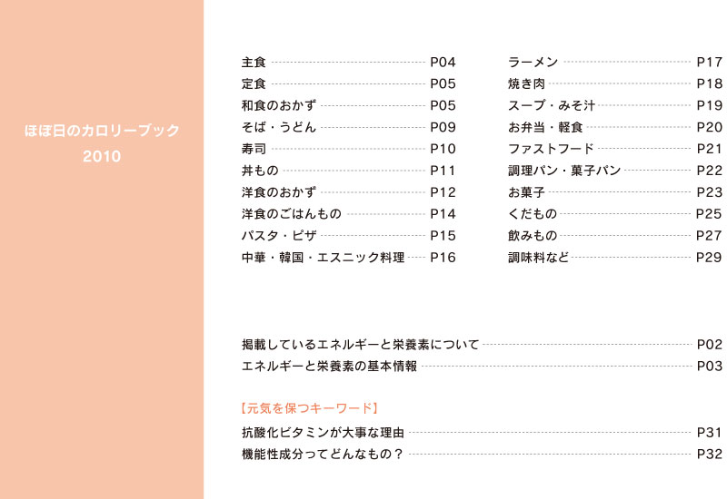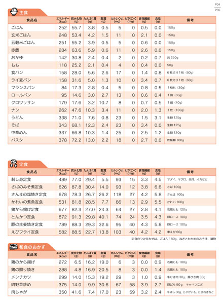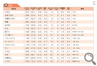 | 内容 | ・20項目401品目掲載 ・各食品についてエネルギーと7つの栄養素が載っています。 (炭水化物、たんぱく質、脂質、 カルシウム、ビタミンC、食物繊維、食塩) ・コラム、グラフページほか |