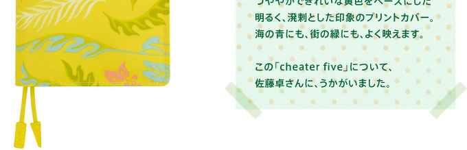 昨年、spring限定カバーとして登場し、 たいへんな人気となりました プリントカバーの「TSアロハ」。 多くのかたに愛されたこのカバーの、 シリーズ第2弾ができました。 グラフィックデザイナーの佐藤卓さんによる オリジナルのアロハ柄です。 つややかできれいな黄色をベースにした 明るく、溌剌とした印象のプリントカバー。 海の青にも、街の緑にも、よく映えます。  この「cheater five」について、 佐藤卓さんに、うかがいました。