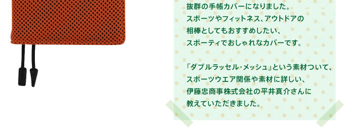 こちらは、「ほぼ日手帳」初のメッシュのカバーです。 スポーツシューズなどに使われている 「ダブルラッセル・メッシュ」という 軽くて丈夫な、ニット生地で作りました。 経編(たてあみ)という製法で編まれた 立体的な構造をもつこの生地は、 通気性、クッション性に富んでいて、 肌触りや、手に持ったときのホールド感が 抜群の手帳カバーになりました。 スポーツやフィットネス、アウトドアの相棒としても おすすめしたい、スポーティでおしゃれなカバーです。  「ダブルラッセル・メッシュ」という素材ついて、 スポーツウエア関係や素材に詳しい、 伊藤忠商事株式会社の平井真介さんに教えていただきました。
