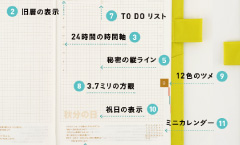 | ページ構成 | 年間カレンダー(2013年、2014年、2015年)/年間インデックス(2014年4月~2015年3月)/月間カレンダー(2014年2月~2015年5月)/週間ダイアリー(2014年3月31日~2015年4月5日)/1日ページ(2014年3月1日~2015年3月31日)/メモページ/おまけページ各種 |