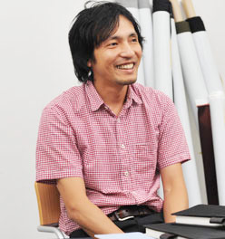日本製のハイクオリティな生地を紹介されている牧野隆司さん。
