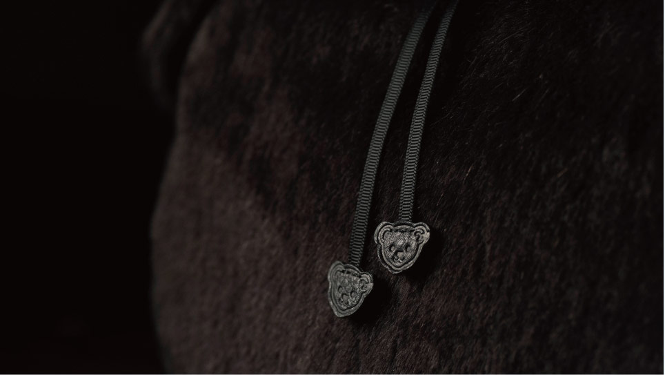 The button and tag attached to the left ear of the bag together make the “Button in Ear,” a trademark of Steiff products. The tag designates that the product has passed the maker’s strict quality standards before being imported into Japan from Germany. The German inscription on the tag “Knopf im Ohr” means “Button in Ear.” This bag is extremely rare in that it bears this trademark, as Steiff has historically reserved the distinct honor for its plush toys.