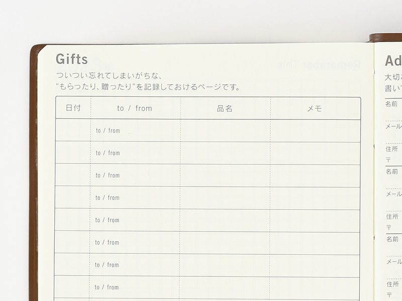Record the presents you’ve given or received in the Gifts page so you don’t forget who gave what to who and when. This is also helpful for thank-you cards. There are spaces for 17 entries in the A6-size book and 40 entries in the A5-size book.