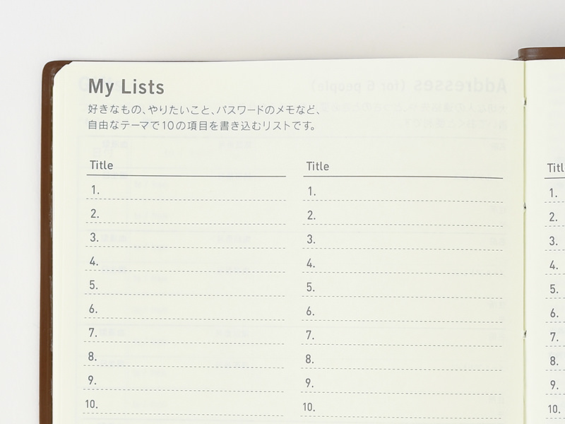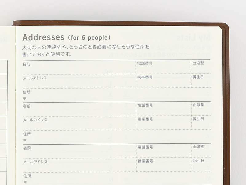 The address book allows you to write in the contact information for people such as family and close friends. The A6-size book has space for 6 entries, and the A5-size book has space for 16 entries.