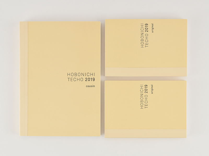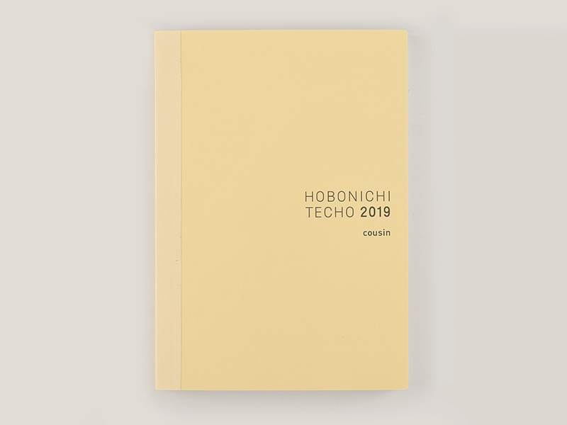 The front of the planner book is made of strong card stock with a soft ivory hue, and includes the label “HOBONICHI TECHO 2019 cousin” printed in gray letters. The April-start version also lists the label “spring.”