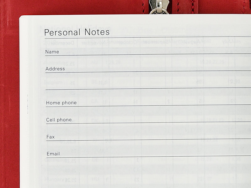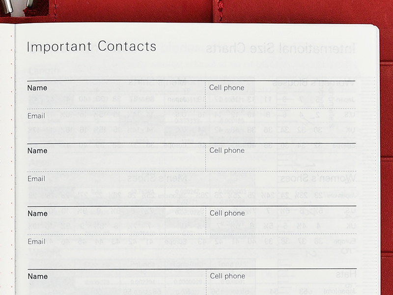 This page provides a place to keep up to 7 entries of often-used contacts and emergency contact information.