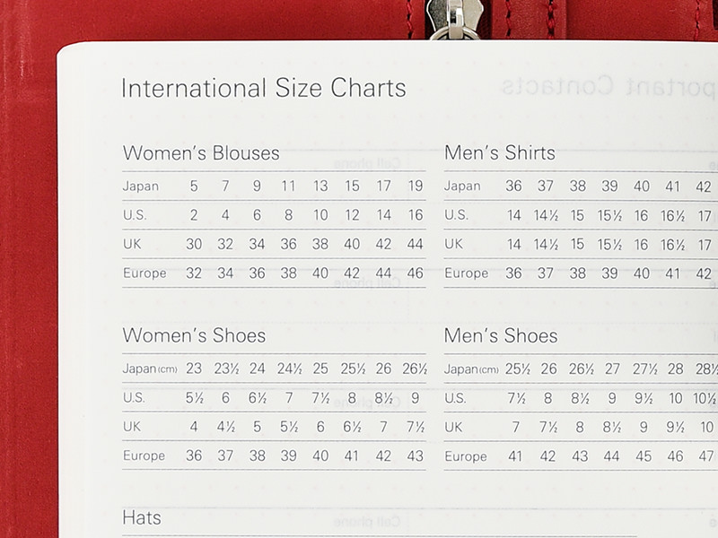 Comparison charts for Japan, the US, the UK, and Europe include items such as clothing, shoes, hats and rings.