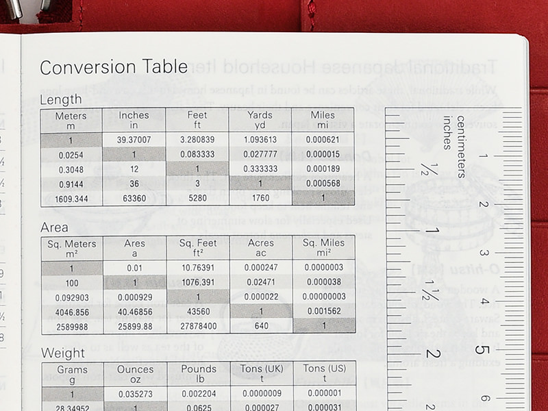 This chart features conversions between units of measurement for easy reference and calculation, including a small ruler to measure centimeters and inches.