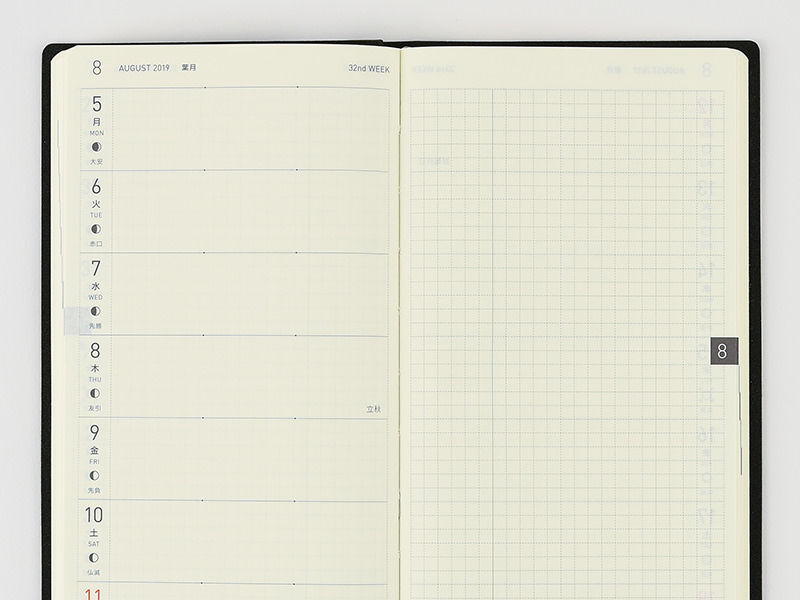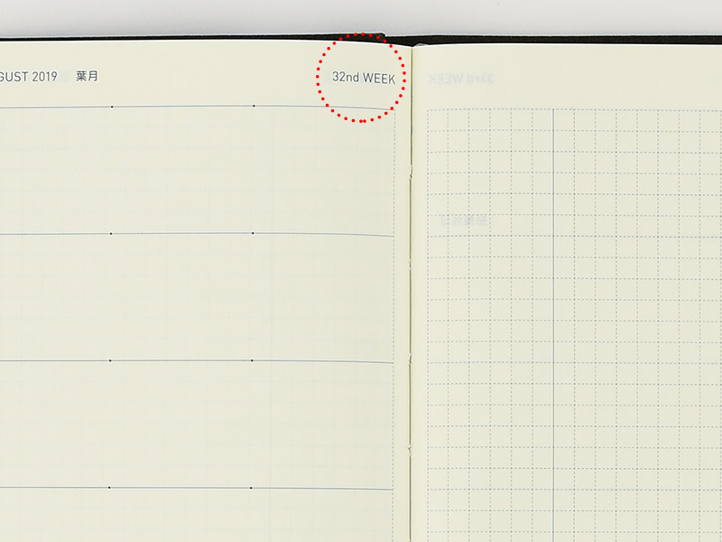 The right page on each weekly spread contains blank graph paper to give full reign to users when drawing out plans or writing out schedules. You can also draw lines across the page to correspond with each of the 7 days on the left to give yourself more writing room. At 3.55 mm, the graph paper’s grid is slightly smaller than that of the daily planners.