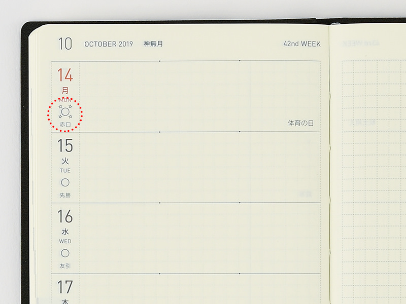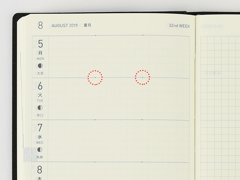 In order to facilitate the most efficient use of the limited space in each day, we’ve included two subtle dots to split each day into morning, afternoon, and evening. You can use these however you see fit, such as writing plans in the two left spaces and random notes in the one right space, or disregarding the dots altogether.