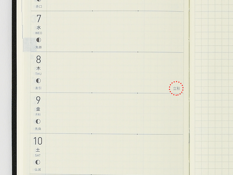 The weekly page shows solar terms that make up the 24 points in traditional East Asian lunisolar calendars. These include well-known days such as the start of spring and the winter solstice.