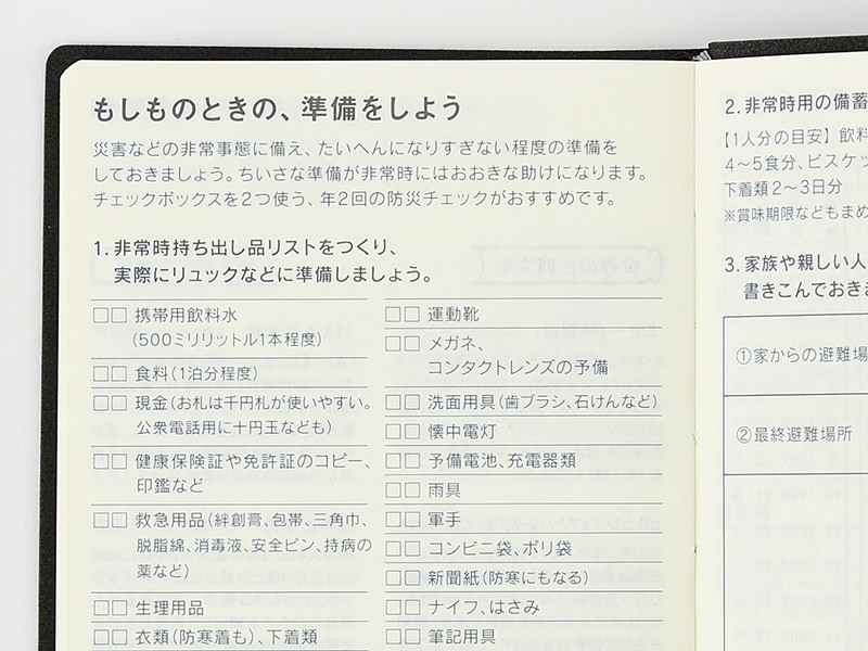 This page contains a checklist of items to have ready in case of an emergency. There is also a space to list nearby evacuation zones (common in Japan), emergency contact information and topics discussed between family and friends.