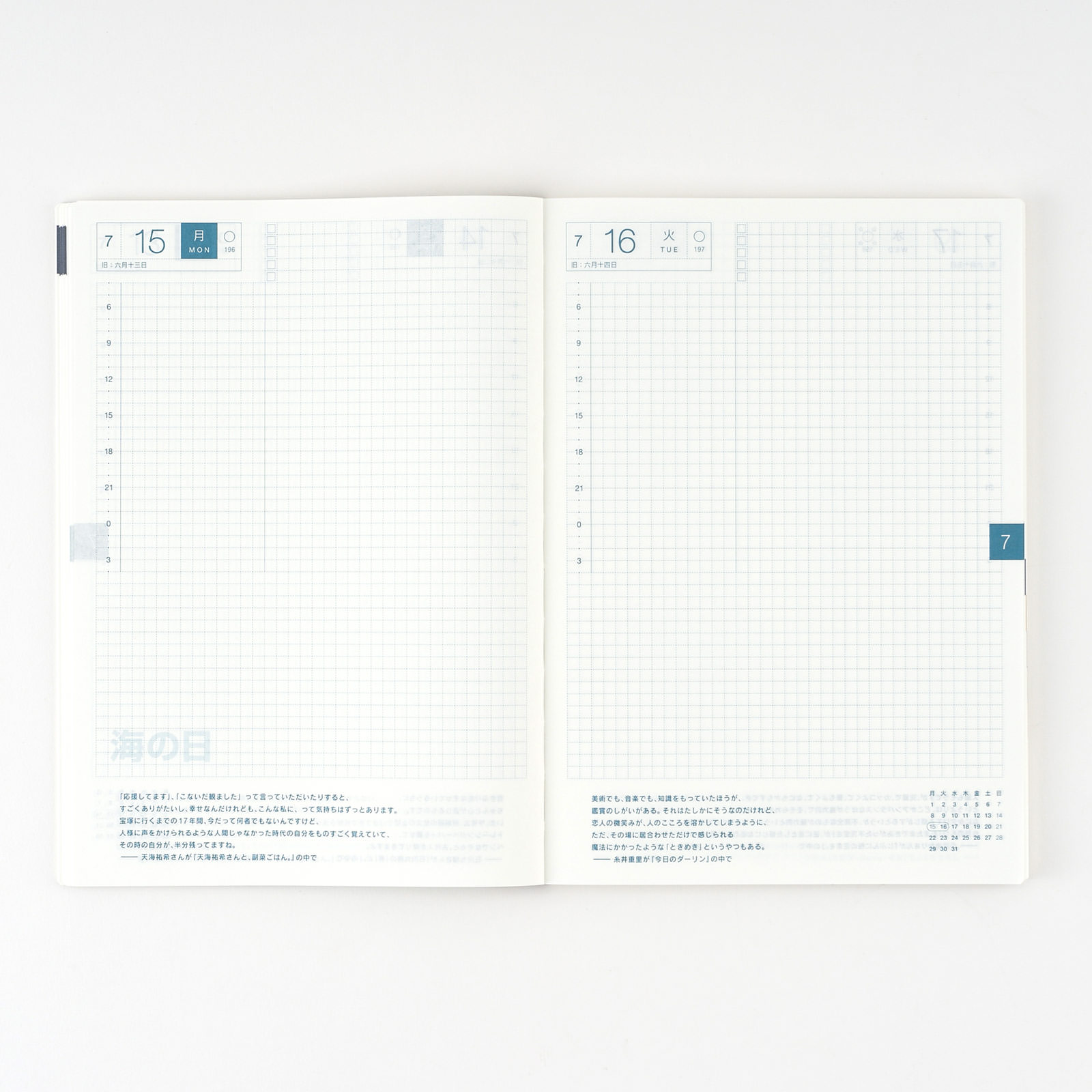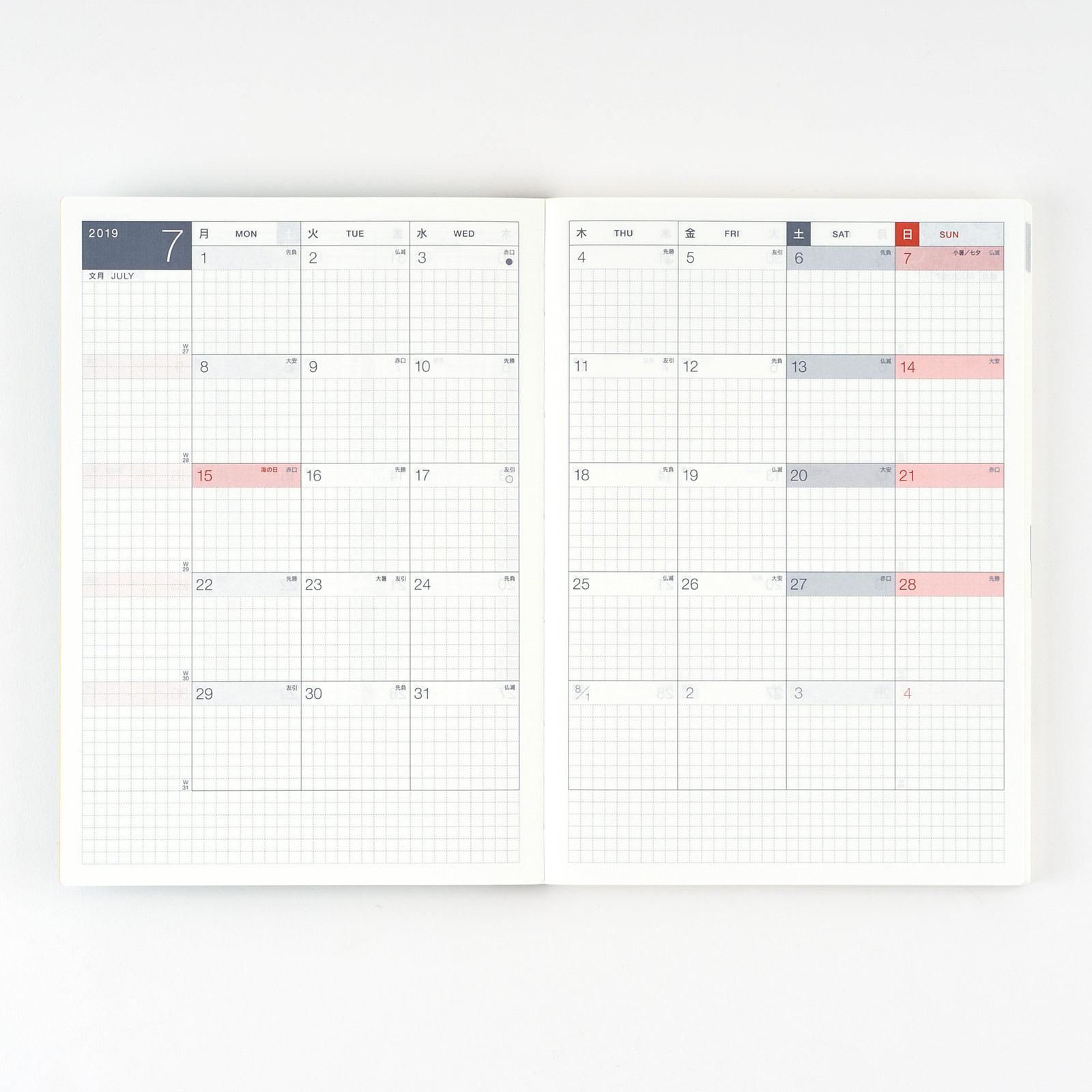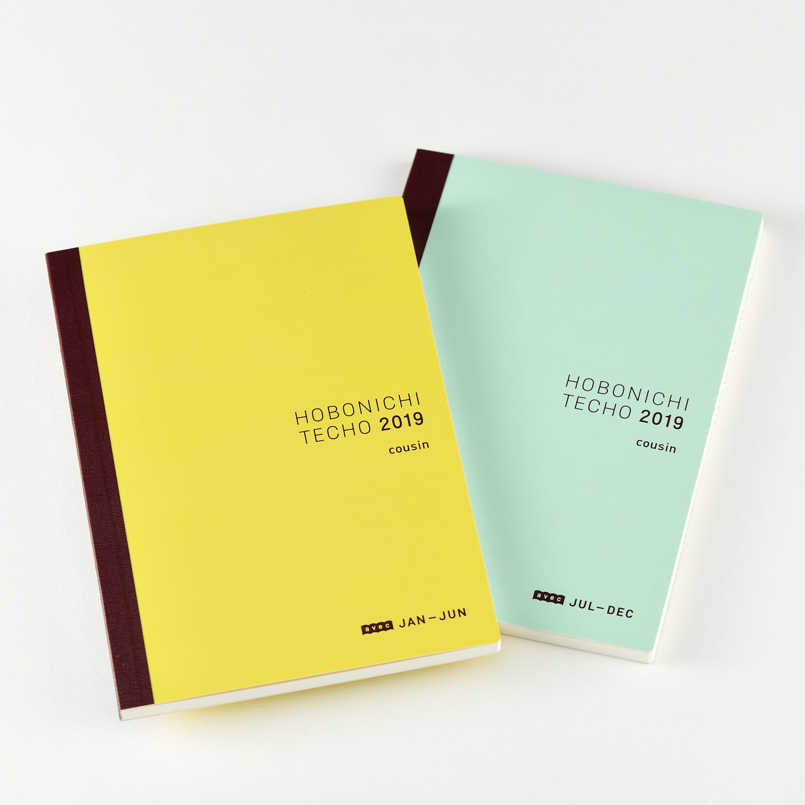 We first introduced the Avec in response to customers who struggled with bulging books after collecting a year's worth of pasted material in the daily pages. The Avec version splits the Japanese A5 Hobonichi Techo Cousin, design and all, into a 2-book set at six months each with only slight variances in calendar spans and the number of extra pages in the back. This allows you to fill the pages to your heart’s content with scheduling, diaries, little notes, tickets, photographs, doodles, and anything that strikes your fancy.