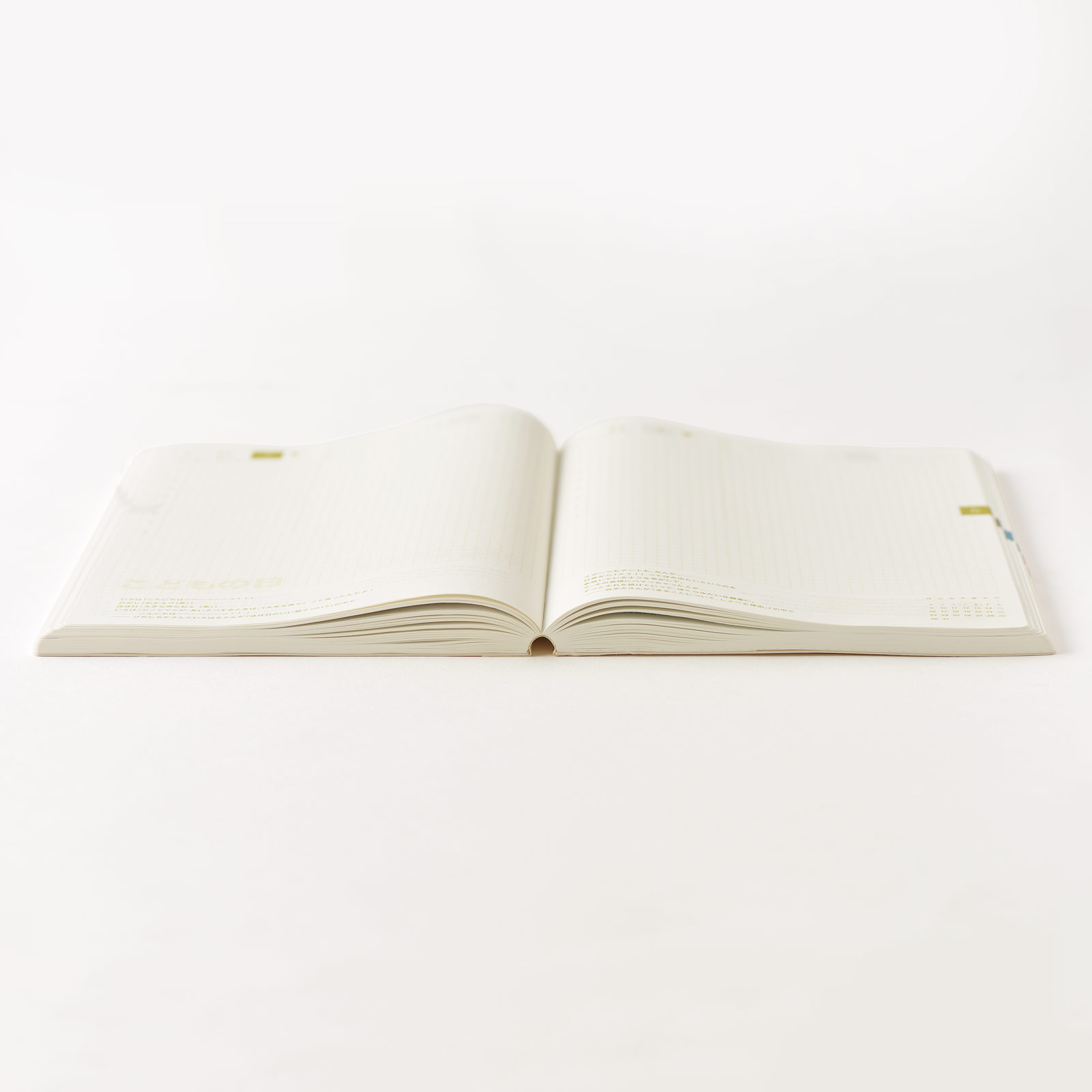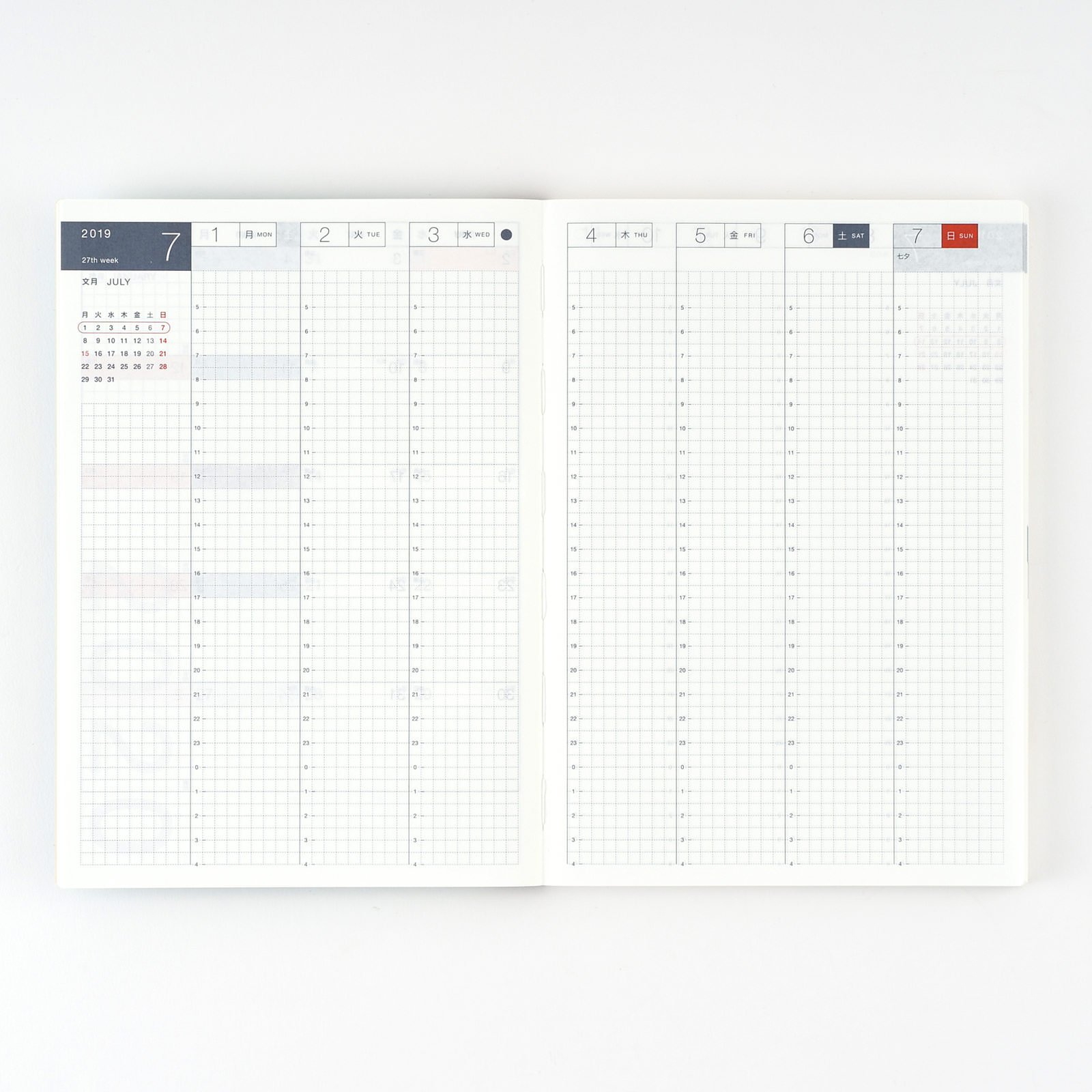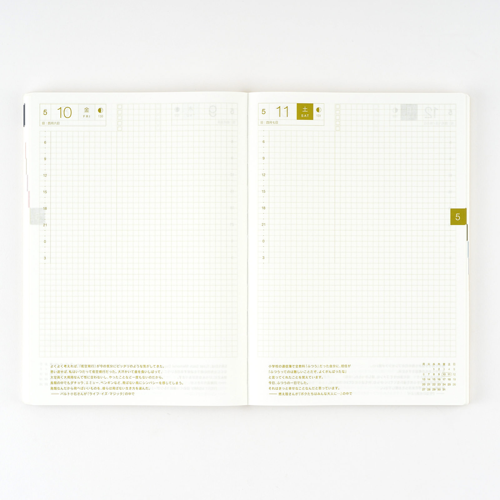 The one-page-per-day A5 size Cousin in Japanese language was created in response to customer requests for a Hobonichi Techo with more space to fill with writing and clippings. The various calendars and pages are great not only for writing down your plans for the day, but for doodling, pasting event tickets, using as a normal notebook for work or school, and filling in pages with any whims that come to mind.