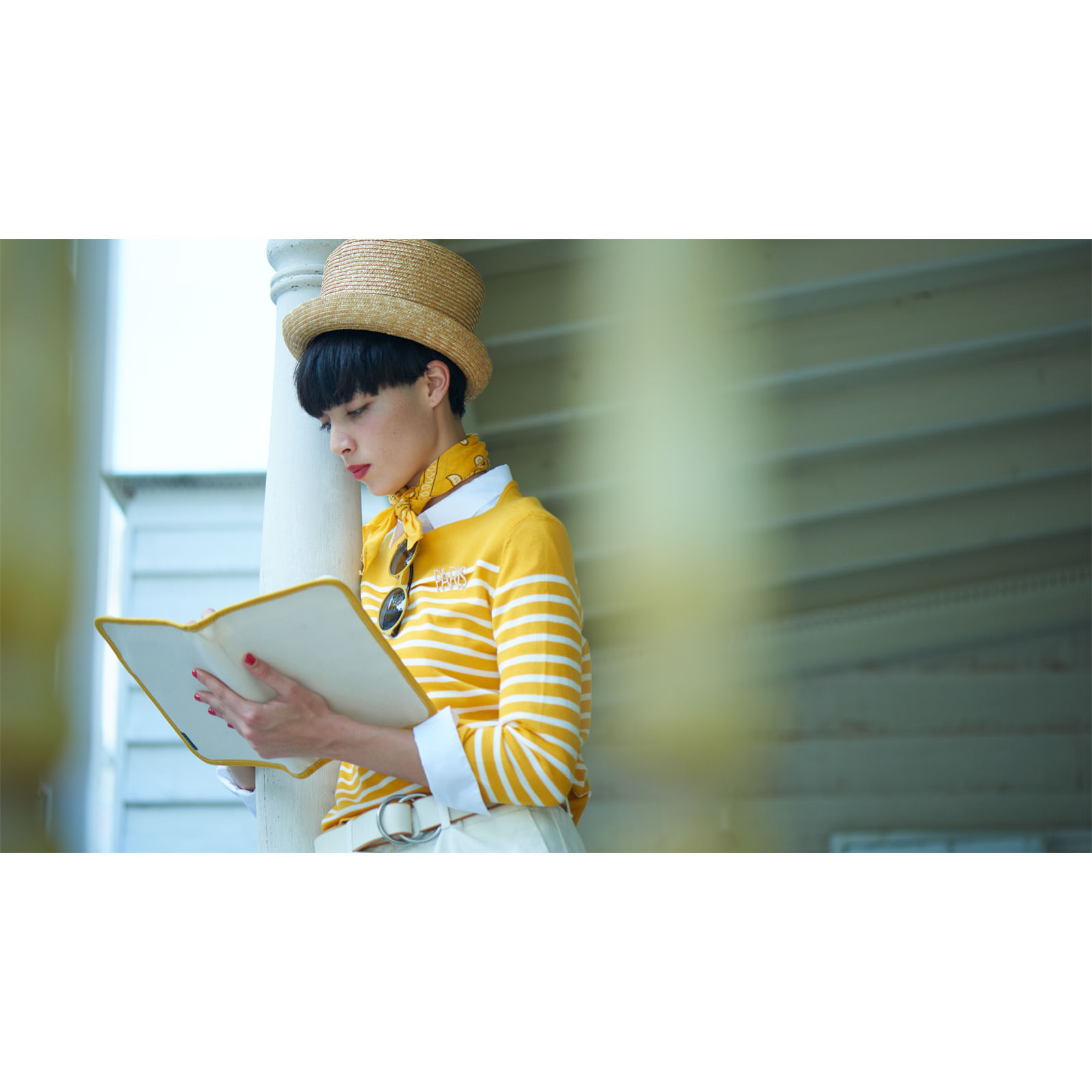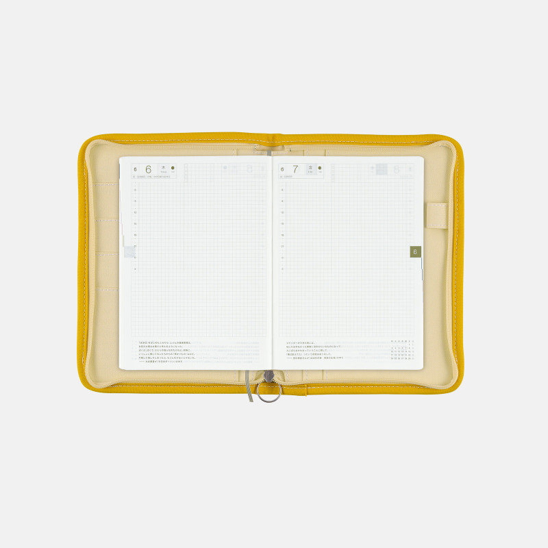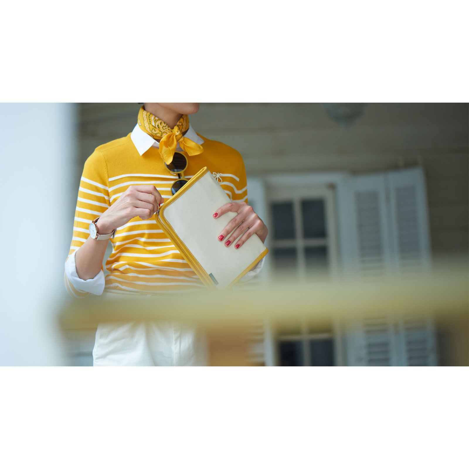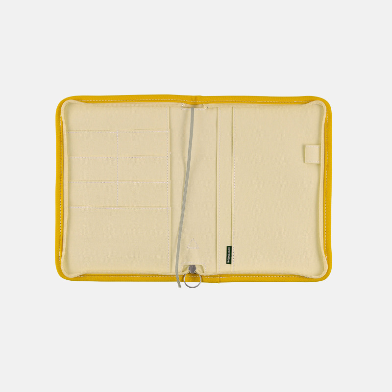 The coarse, off-white cotton canvas surface feels pleasant to the touch and is outlined with subtle mustard-yellow piping. You can handle the cover as roughly as you would a sturdy tote bag, and never tire of its nice look as you carry it with you every day.