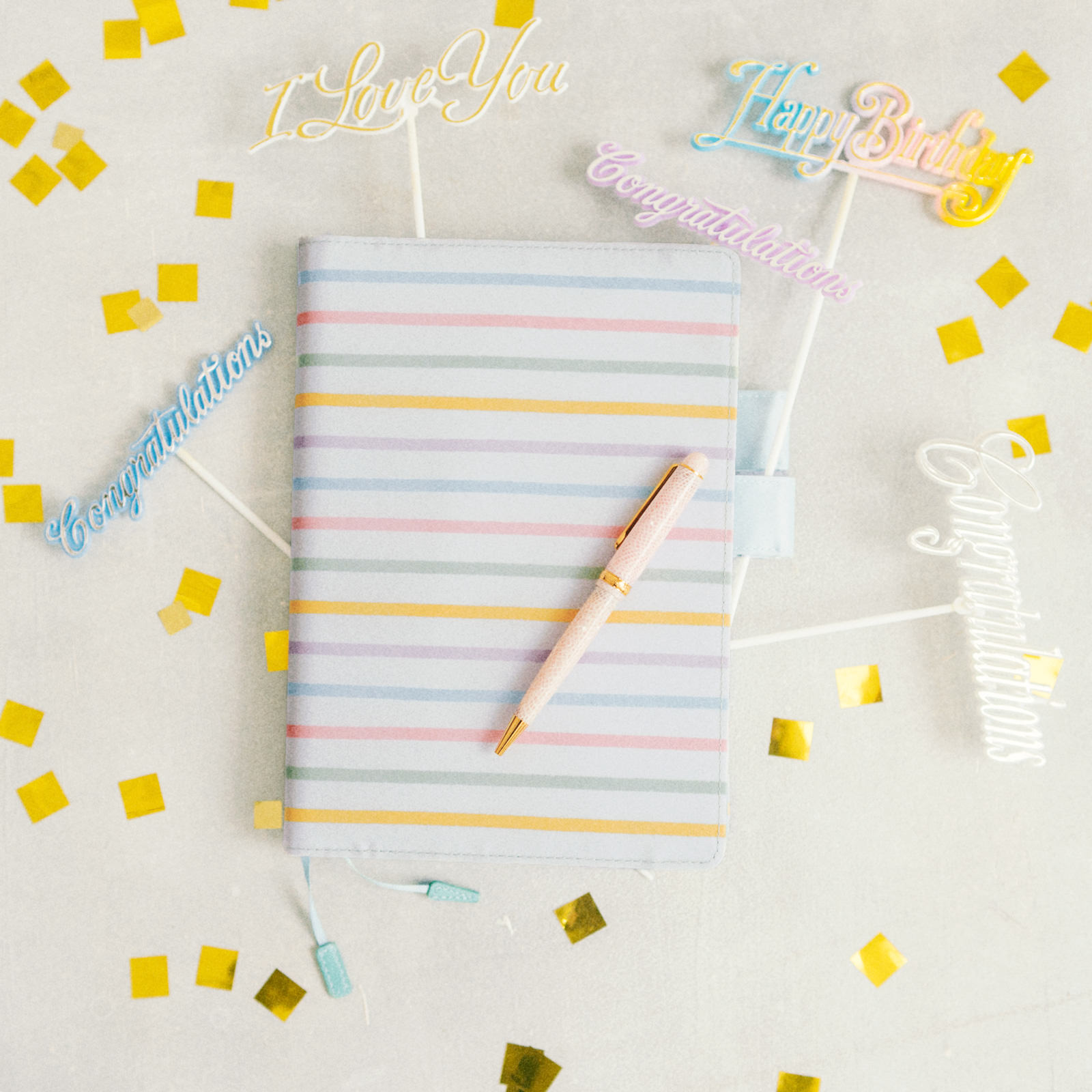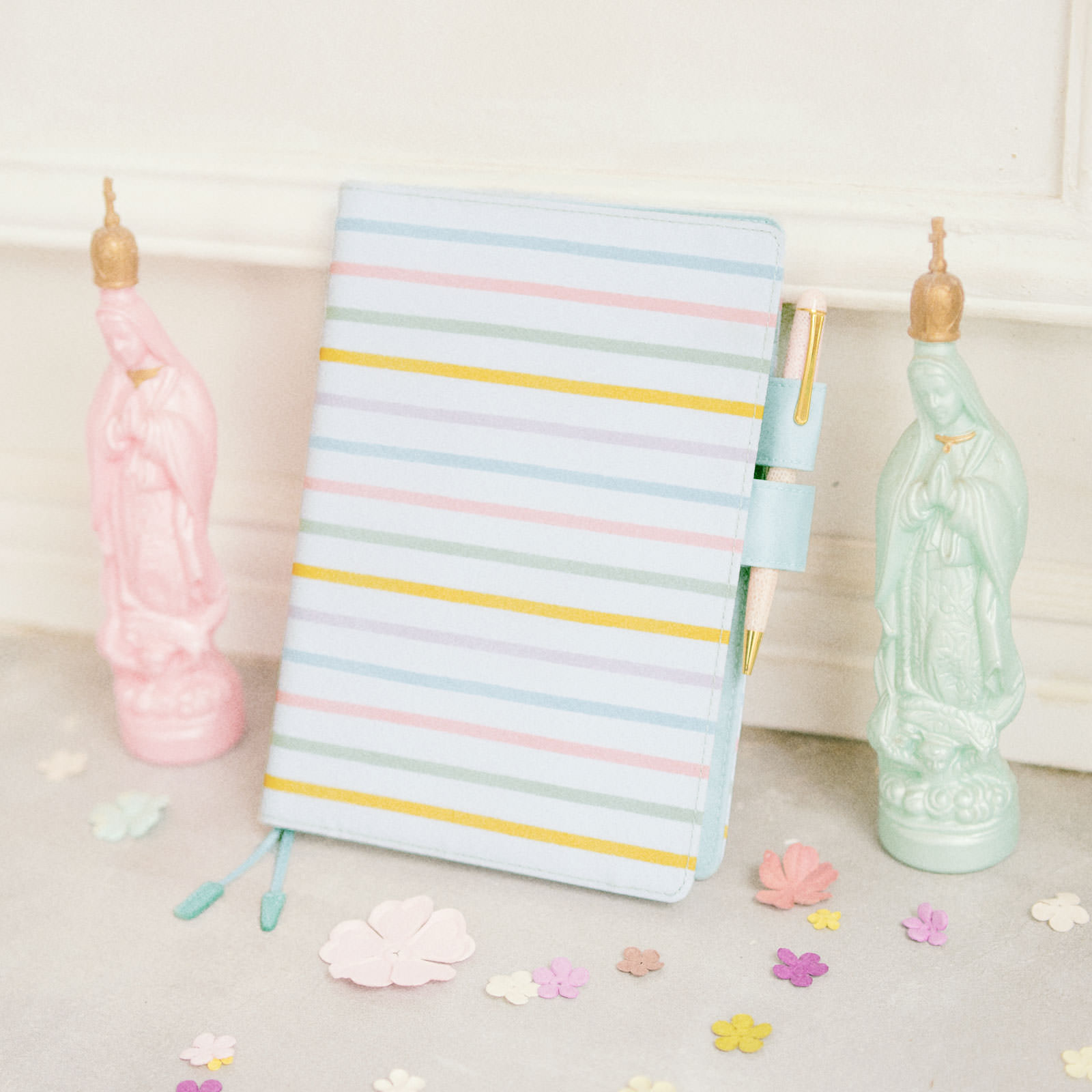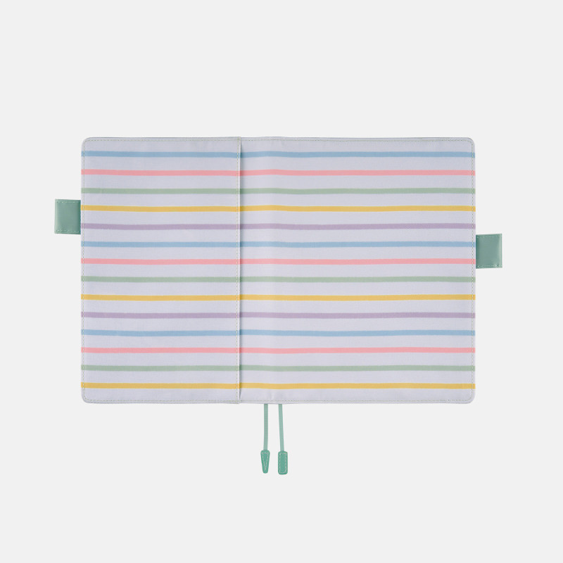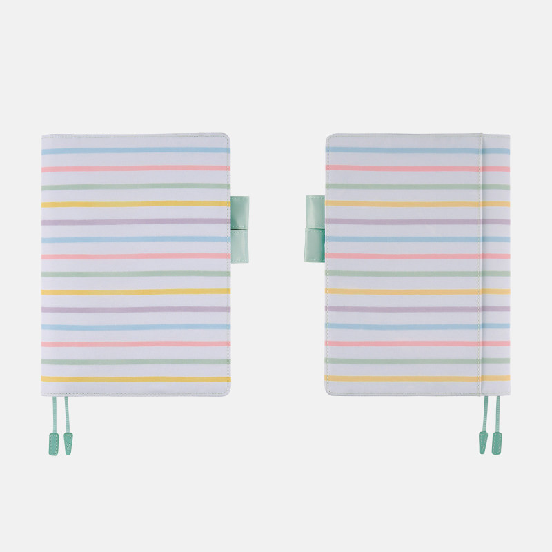 This colorful cover features blue, pink, yellow, green, and purple pastel stripes over a light gray background. In the past, striped covers for the Hobonichi Techo have almost always been limited to two colors, so this multicolored design is quite special.