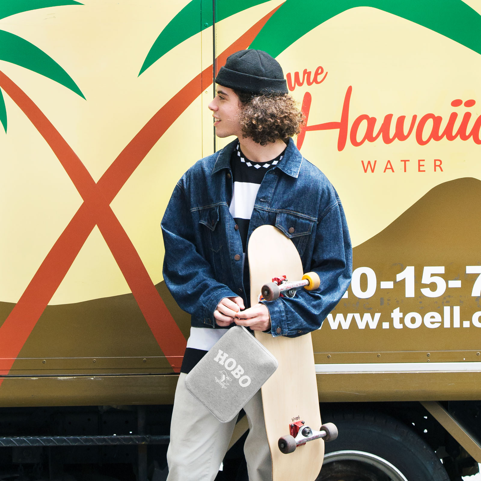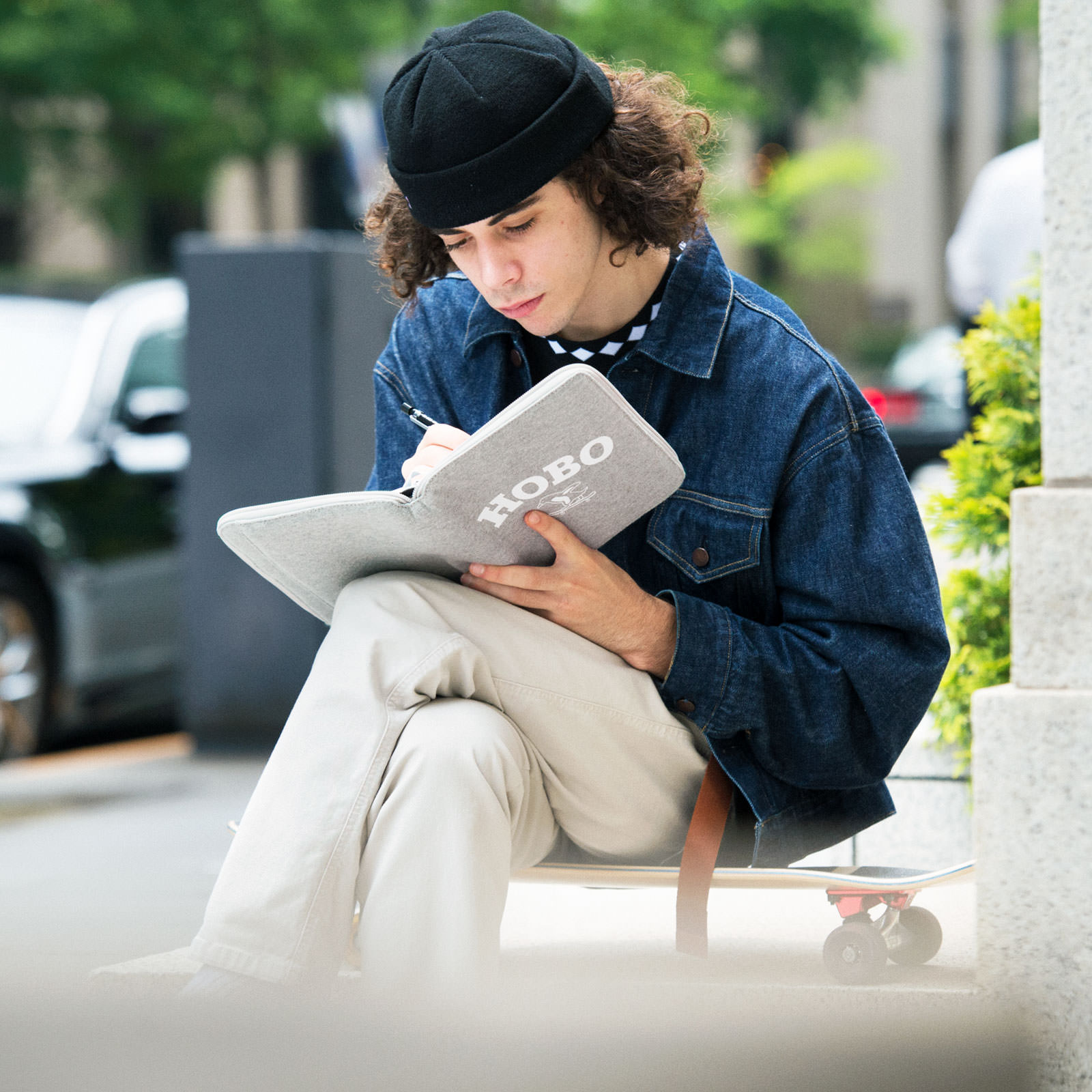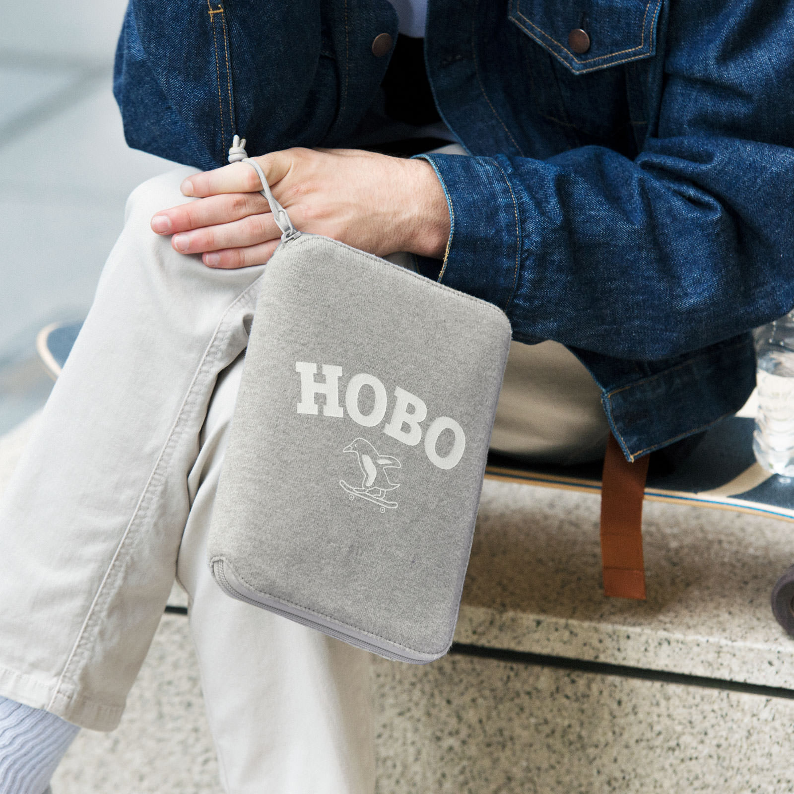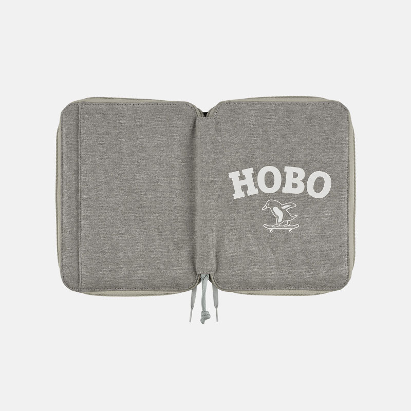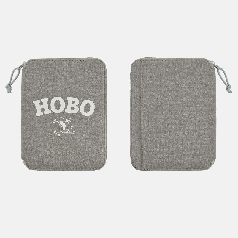 An old-school Hobo logo (short for Hobonichi) and a skateboarding penguin are printed with silkscreen on the front of the cover. The zipper pull is a type of sturdy cord often used in outdoor items, making it durable and easy to handle.