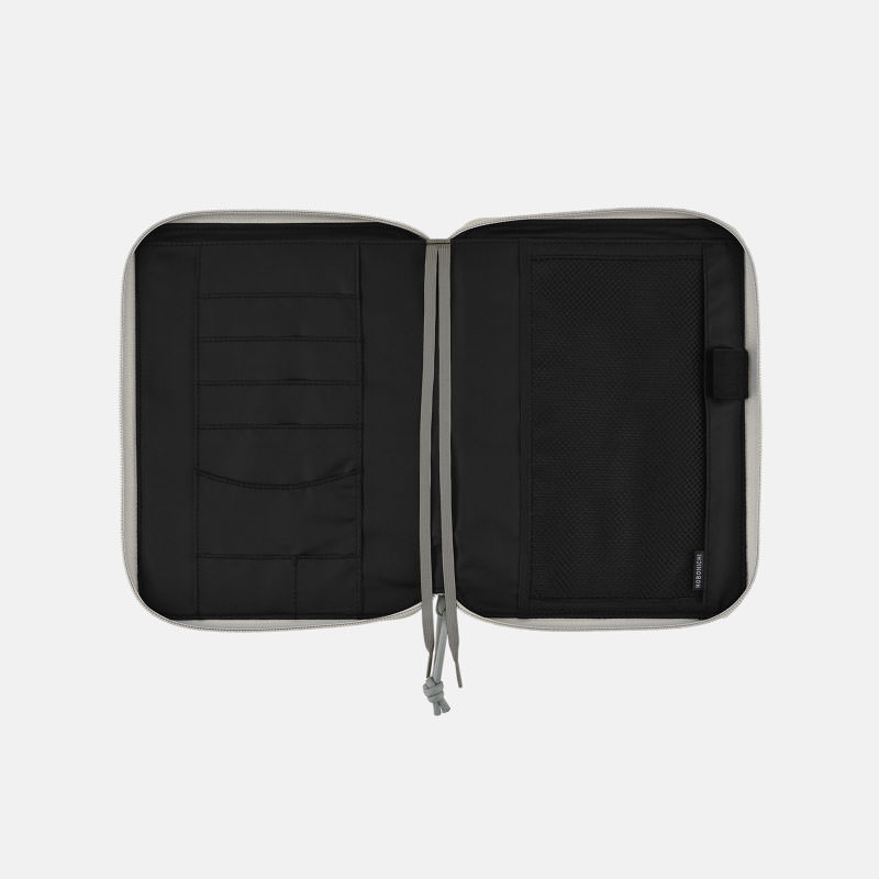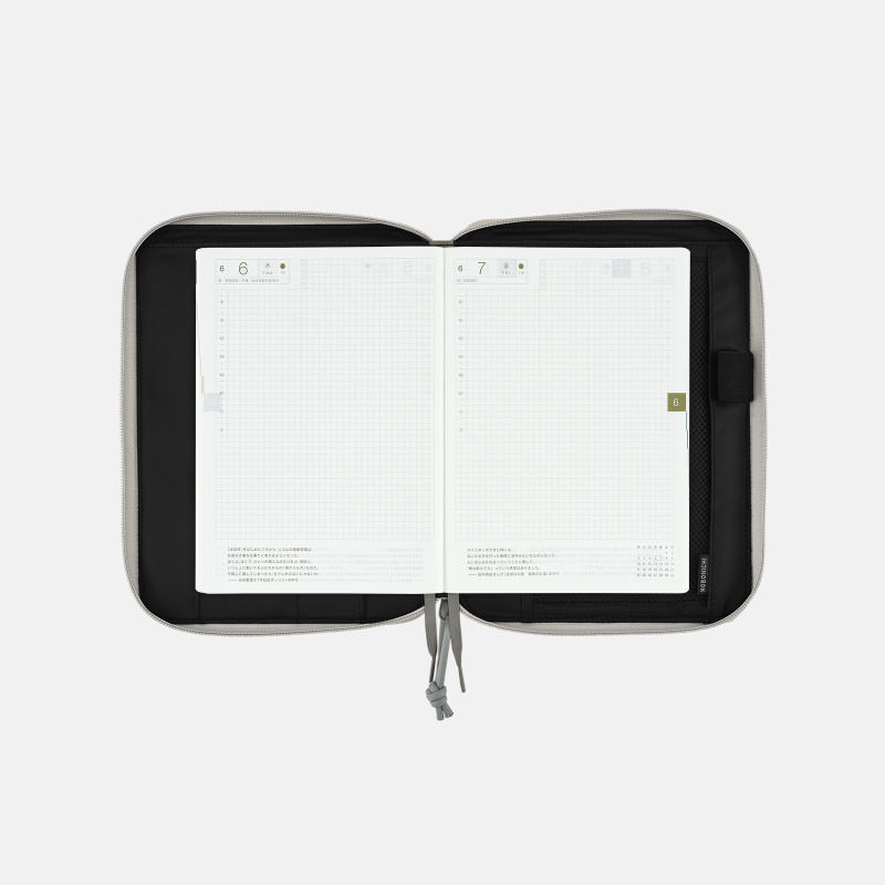 In order to match the theme of the cover fabric, the plain cloth bookmarks are tightened into balls at the ends, much like the cords on a hooded sweatshirt. As a nice accent to the exterior, the A5 cover has a black interior and gray bookmarks.