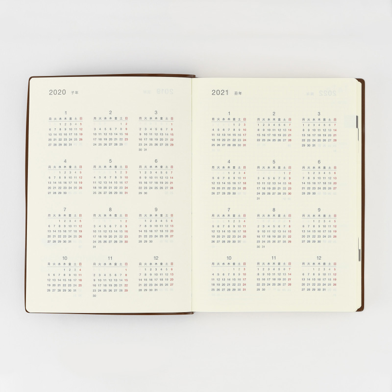 By popular demand, we’ve added the A5 size “Large 5-Year-Techo” to our lineup this year. The book has pages dated across a 5-year span.