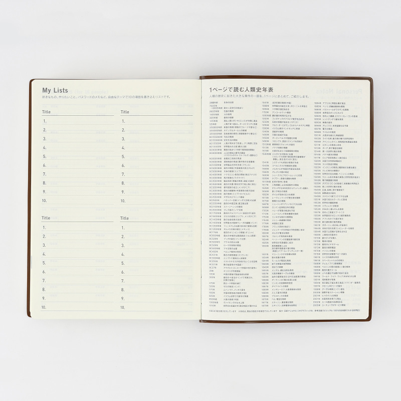 The start of the book contains a yearly calendar across the 5-year span. The back of the book contains useful pages such as “A Year Per Page” memo pages, “Gifts” for tracking gifts given and received, “Addresses” to list important contact information, “My Lists” for making a list of any theme of your choice, “Human History at a Glance” for informational reading material, and “Personal Notes” to record information about yourself. (These pages are in Japanese.)