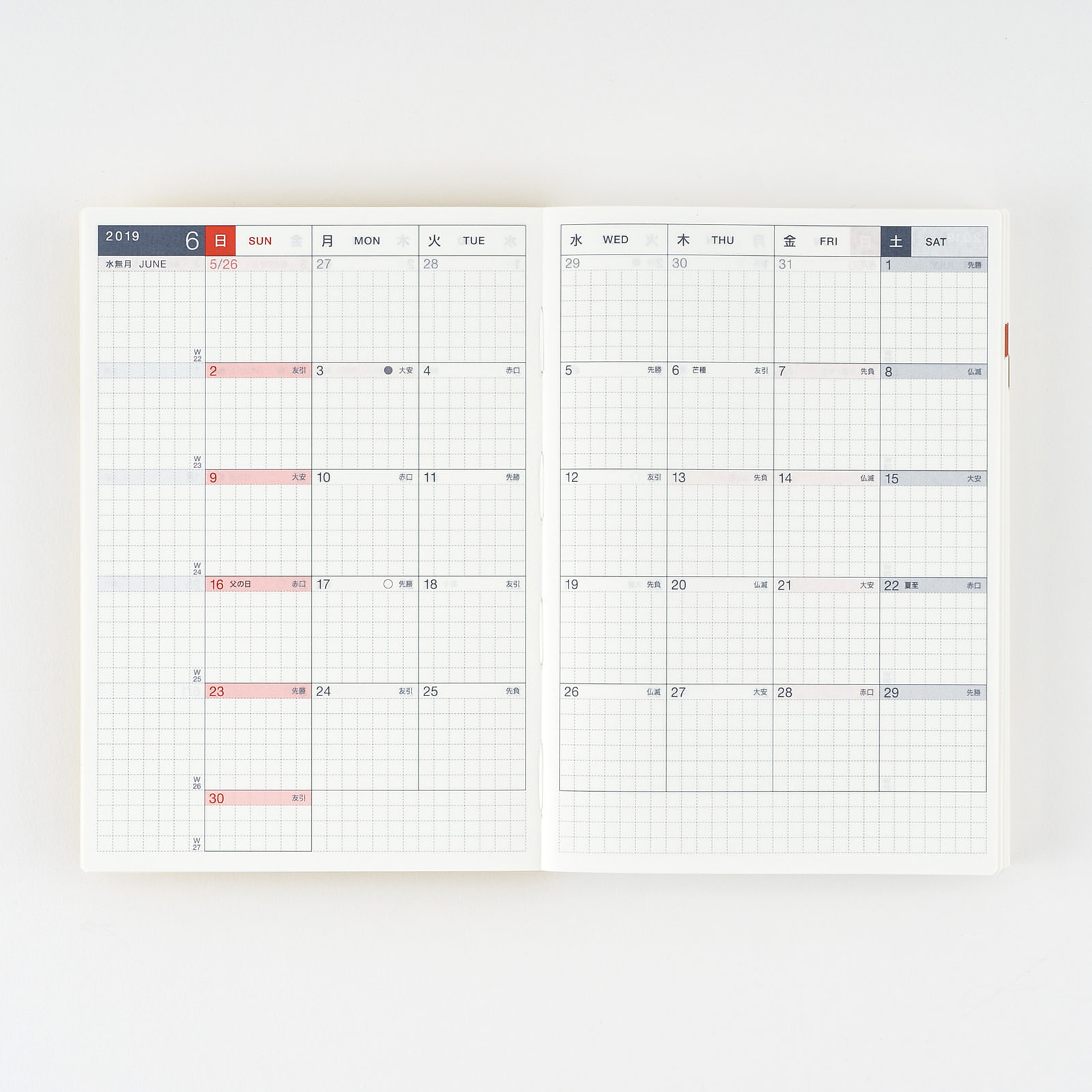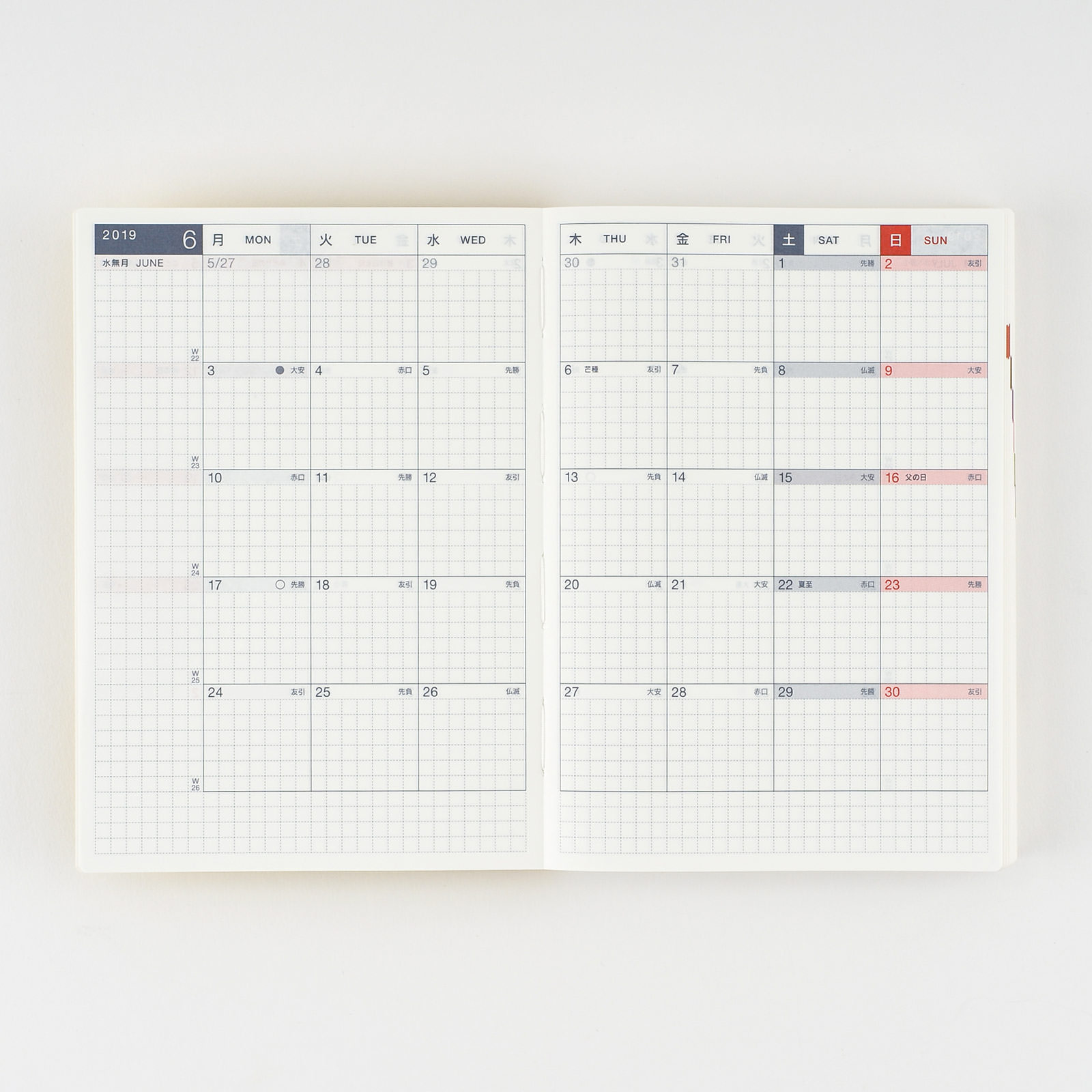 In the Hobonichi Techo Original book, you can choose between a Monday-start week (gray label) or Sunday-start week (red label) for the monthly calendar.