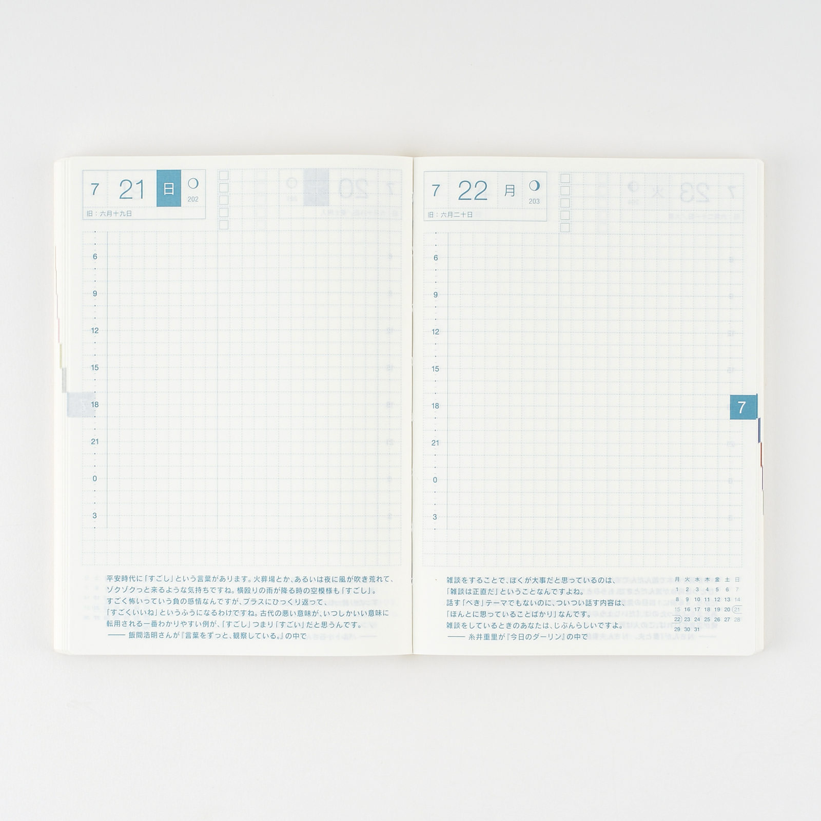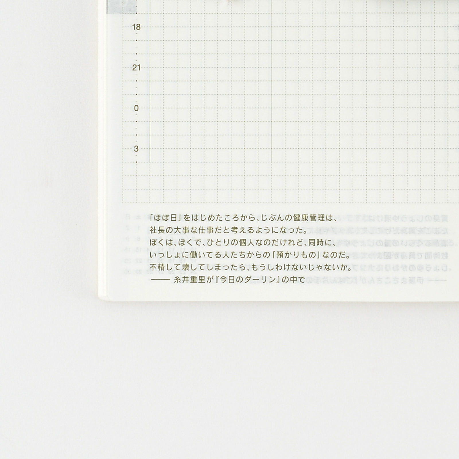 The Hobonichi Techo includes quotes specially chosen from its parent site, the Japanese web magazine Hobo Nikkan Itoi Shinbun. Each daily page has a quote in Japanese.
