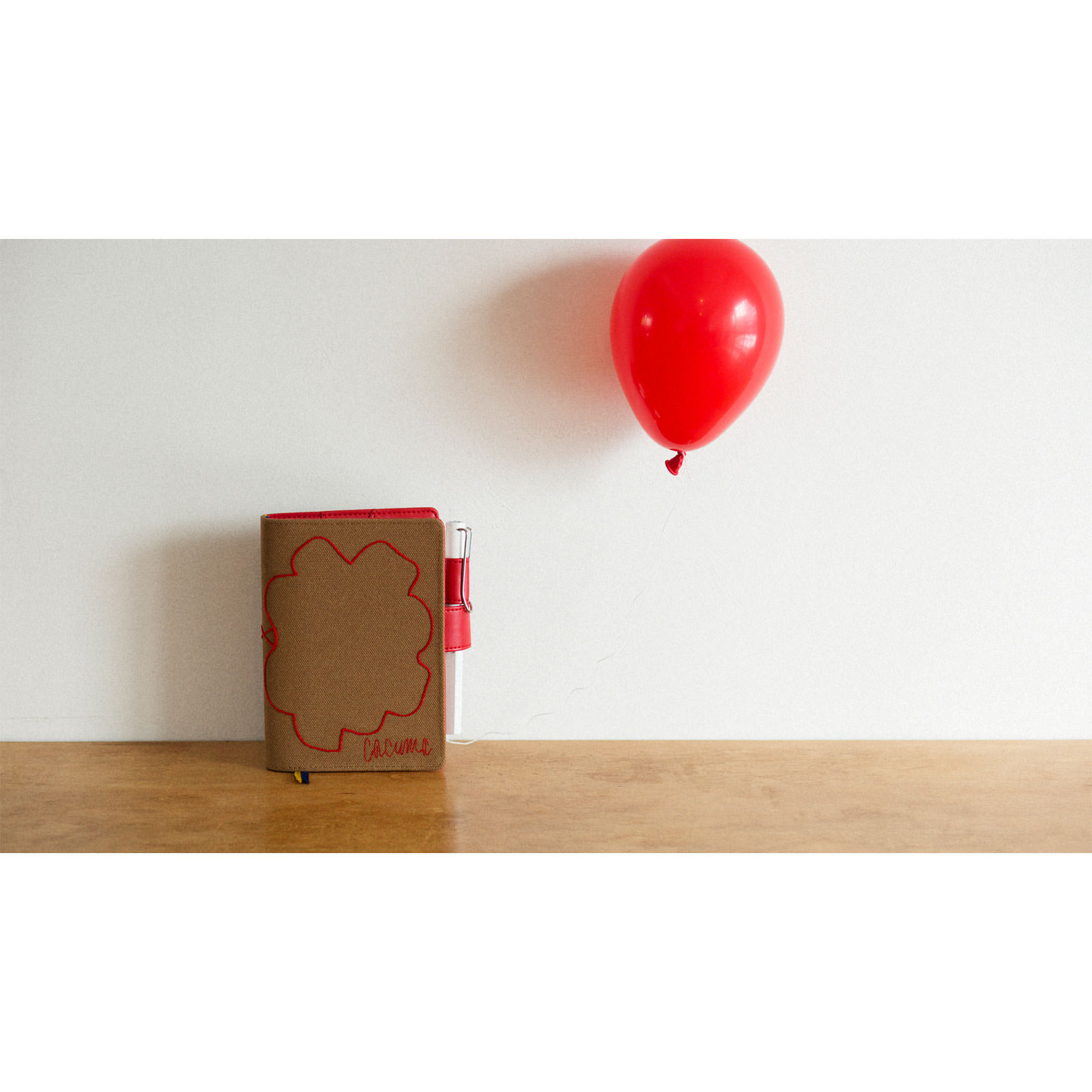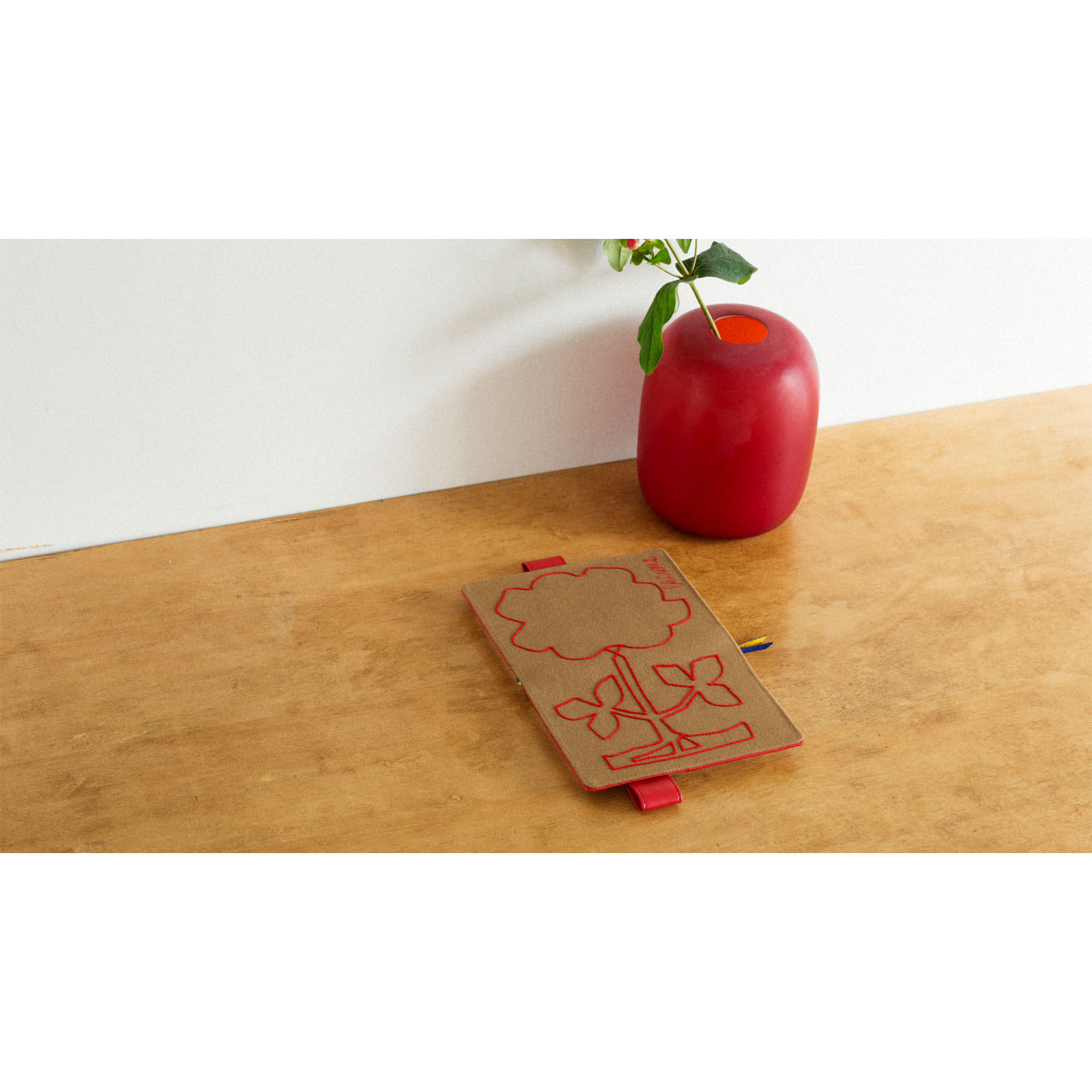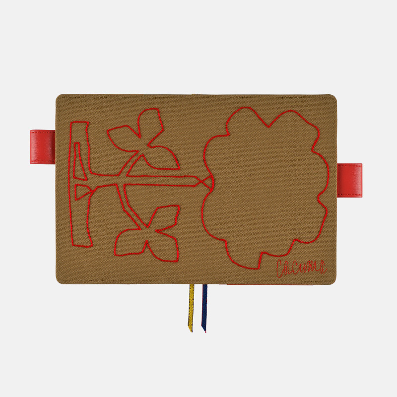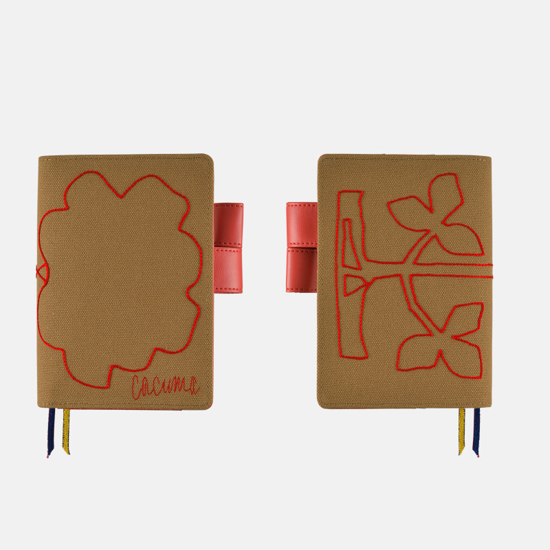 Cacuma is a fashion brand created in collaboration with art director/designer Yoshie Watanabe and Hobonichi. This Cacuma-brand cover features red embroidery on coarse canvas material. The pattern seems abstract at first glance, but open the cover and view it in full to see the image of a rose embroidered in a way that looks like a single-stroke drawing.