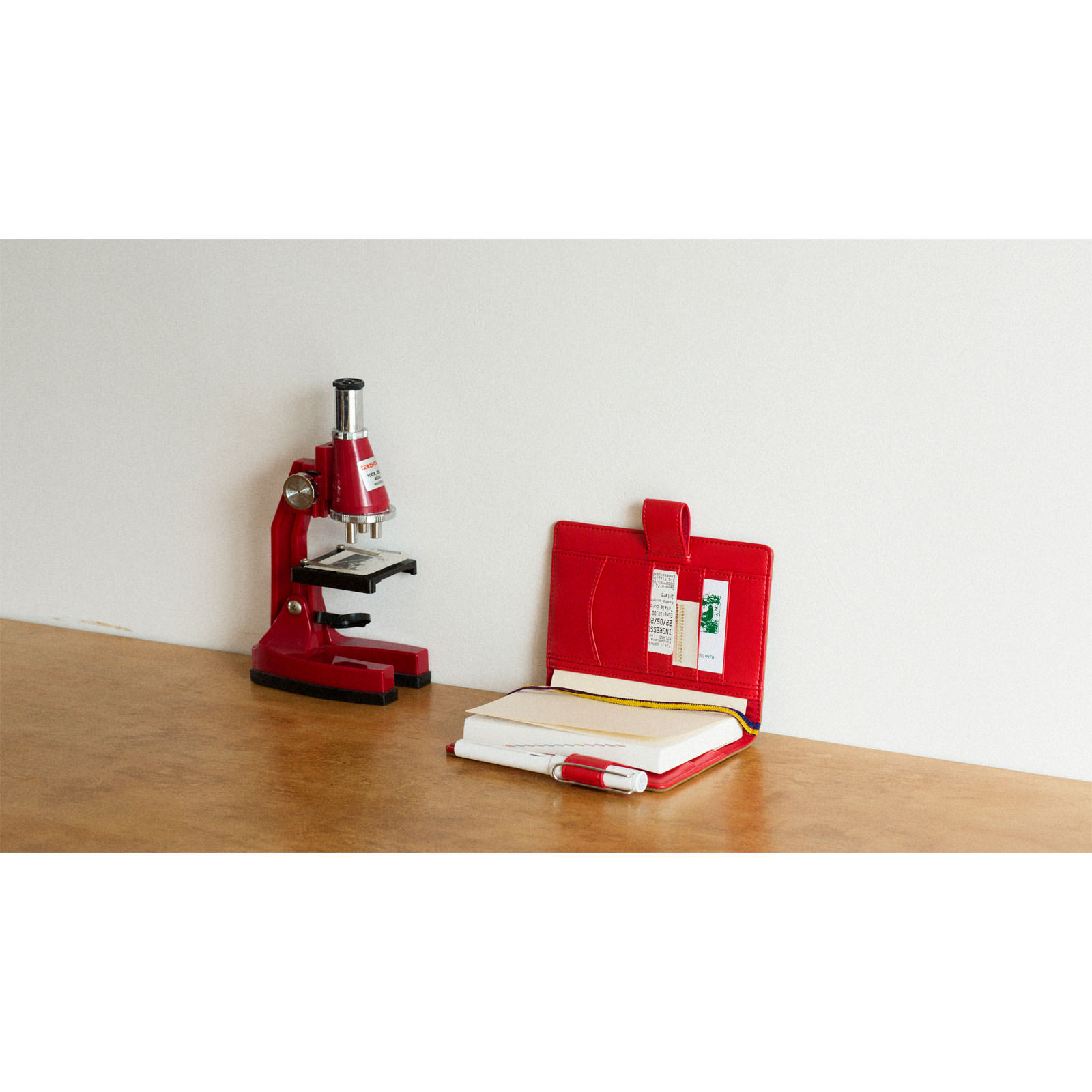 The pen holder and cover interior are made with a faux leather that matches the color of the red embroidery. The color is the perfect contrast with the beige exterior.