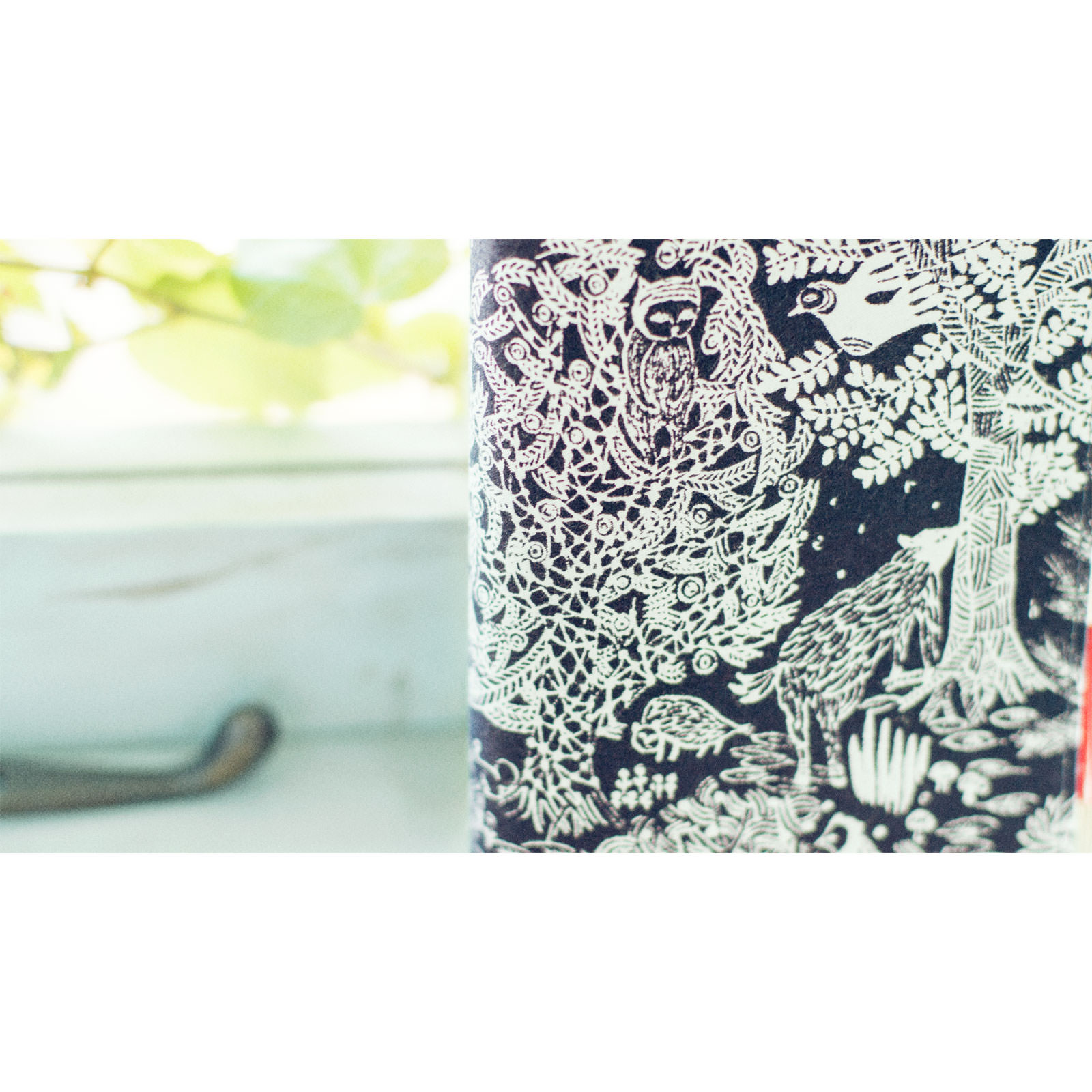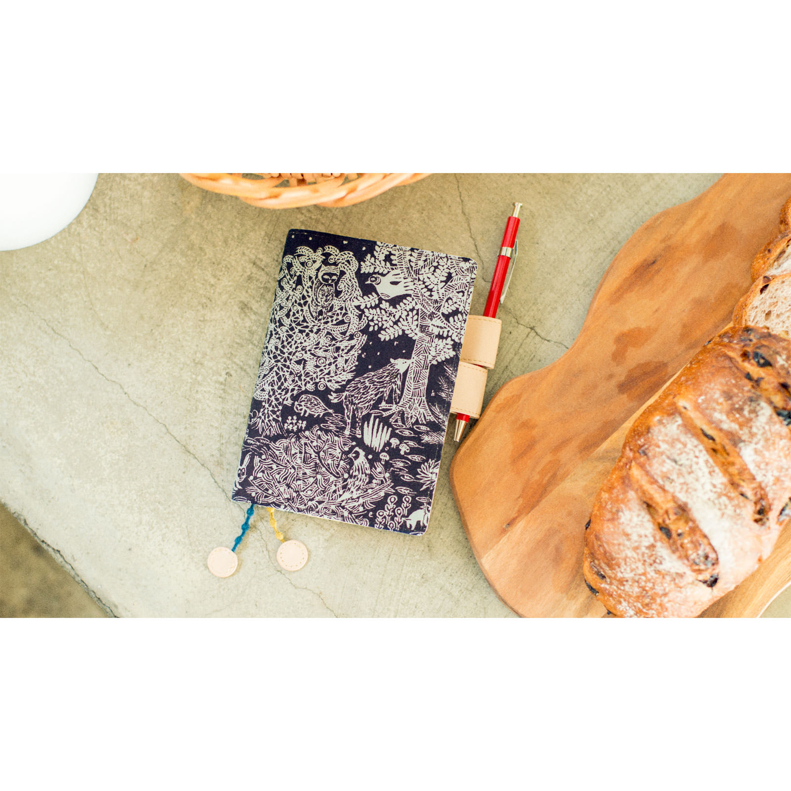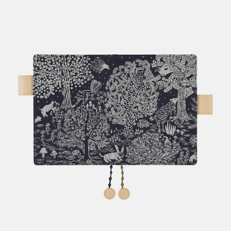 The charm in this design comes from the light, fountain-pen feel of the art, which was drawn on a whim without planning anything out beforehand. The dark navy cover material is made of cotton.