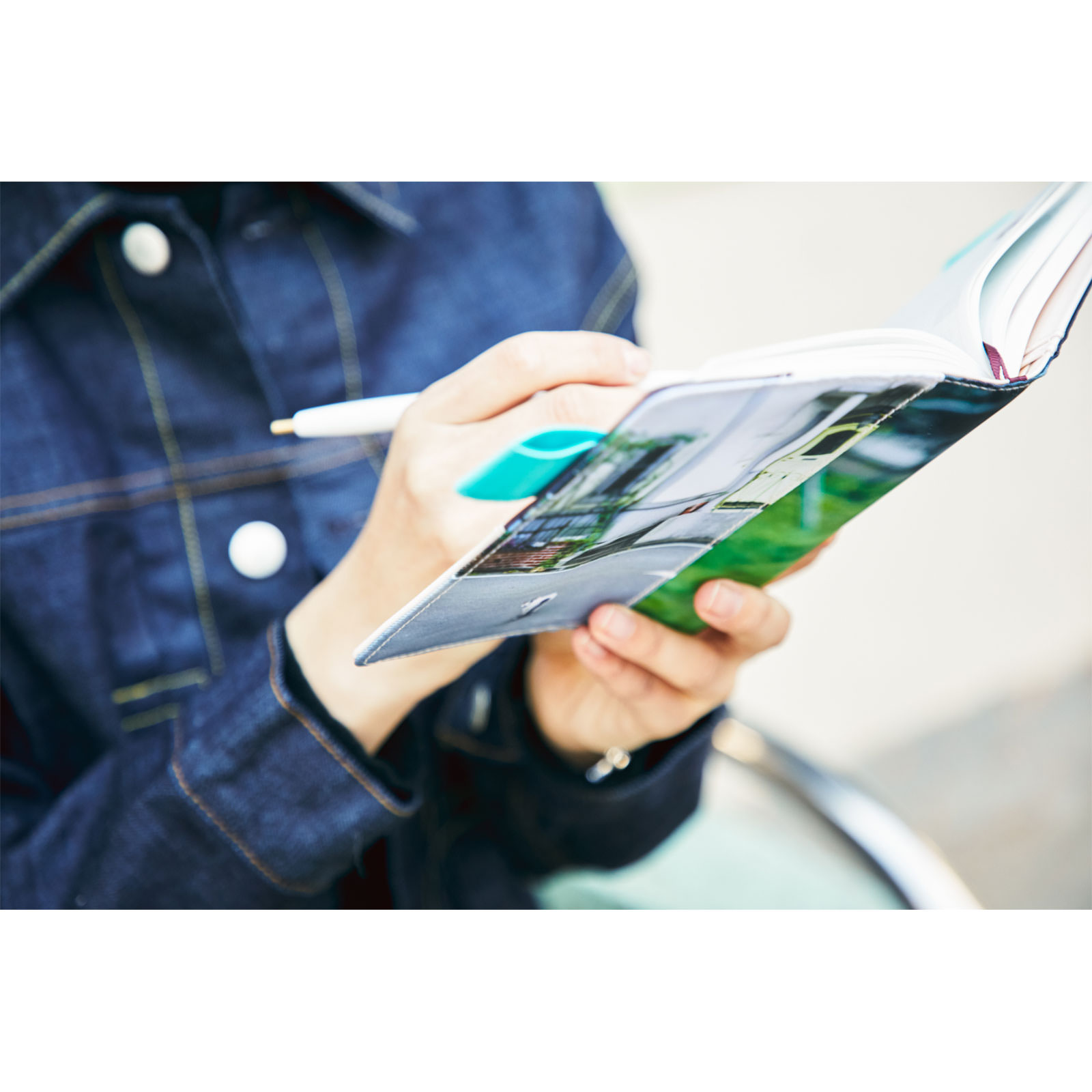 The pen holder is designed to perfectly fit the 12.2 mm (0.48”) diameter Jetstream pen offered as a free bonus gift with select Japanese-version Hobonichi Web Shop products. Pens with certain shapes and materials may be difficult to pull through the holder. The holder can fit pens up to 13.5 mm (0.53”) in diameter.