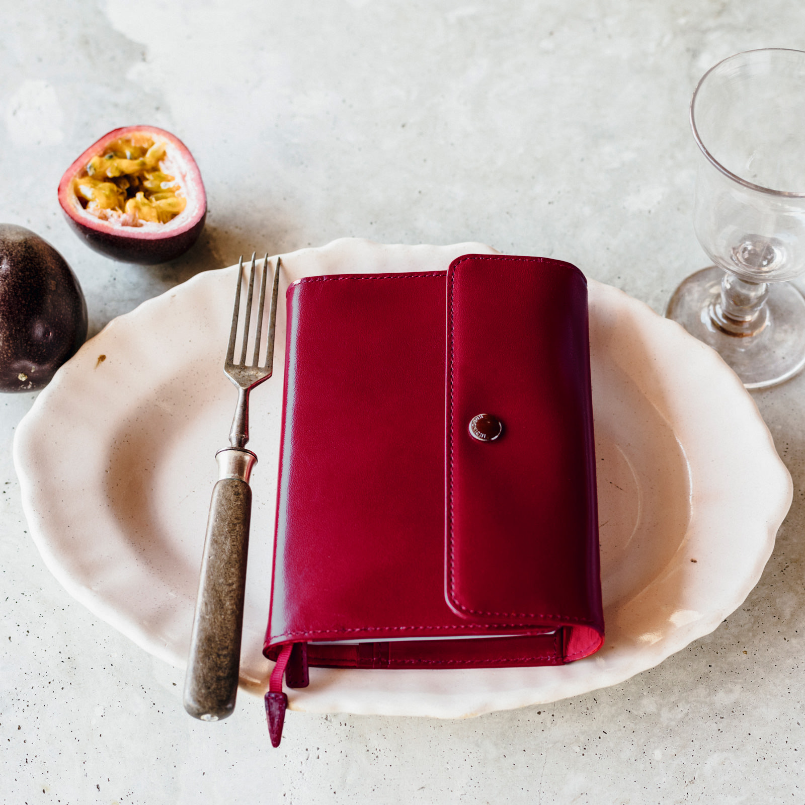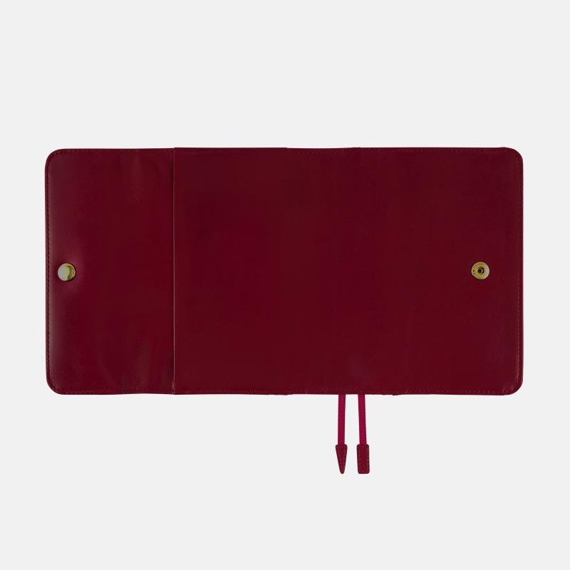 This trifold red leather cover has a mature and distinguished look. The cover clasps shut with a shimmering gold button and can also be carried as a fashionable clutch bag.