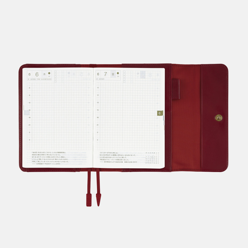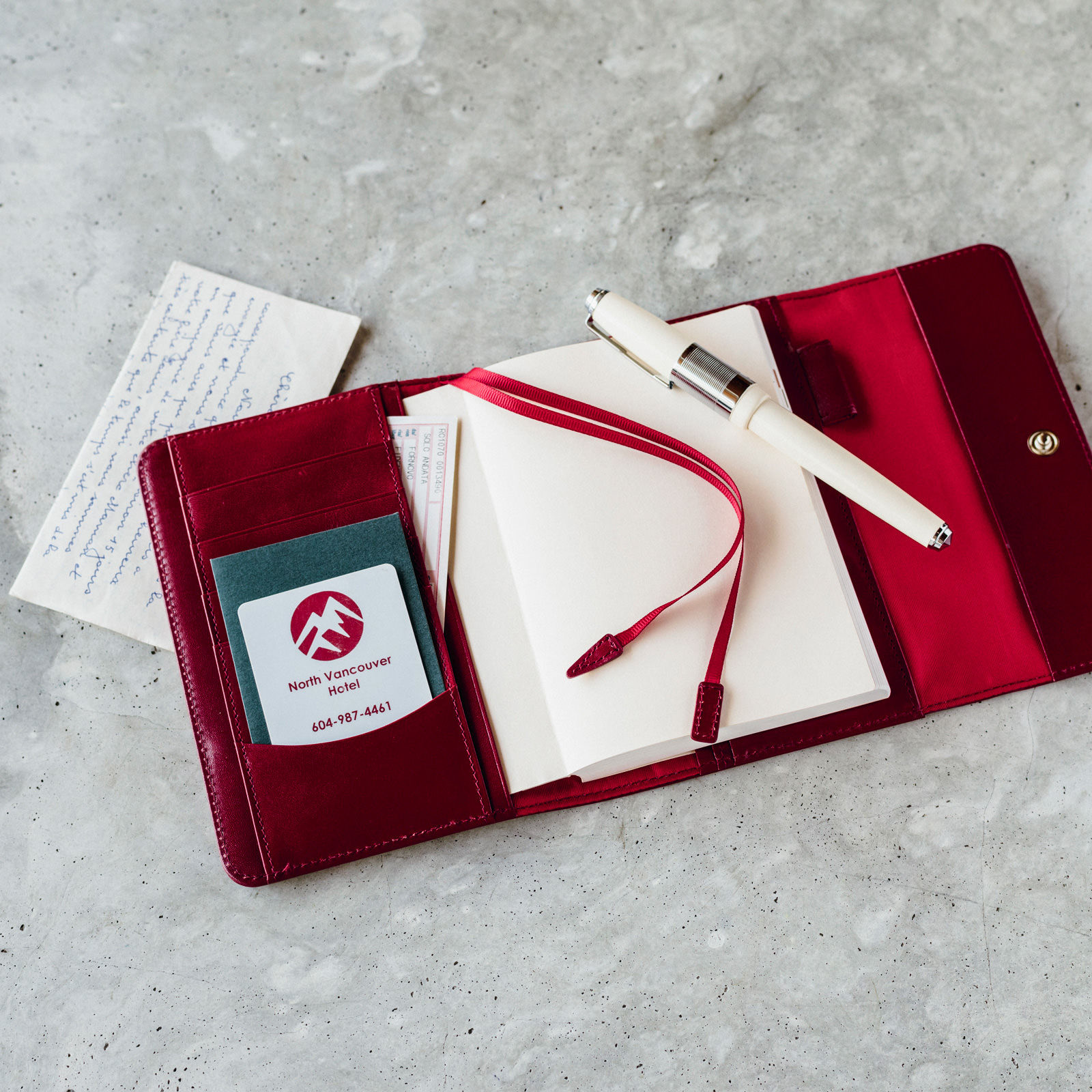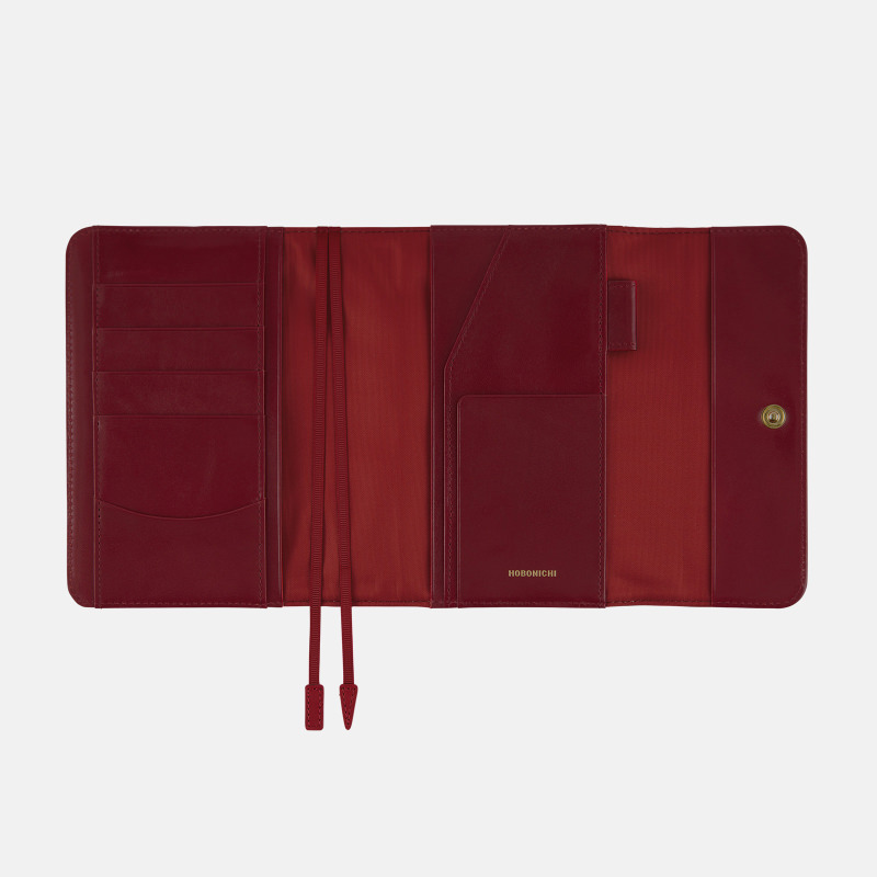 The cover interior includes the same deep red leather, and the card pocket is foil-pressed in gold with the Hobonichi logo.