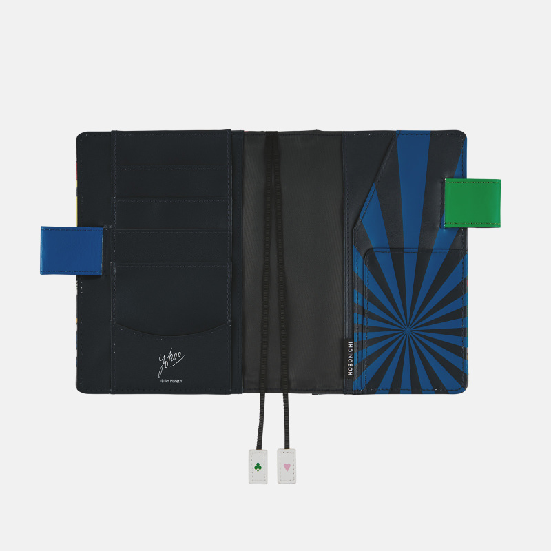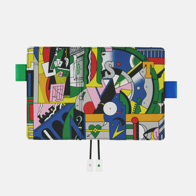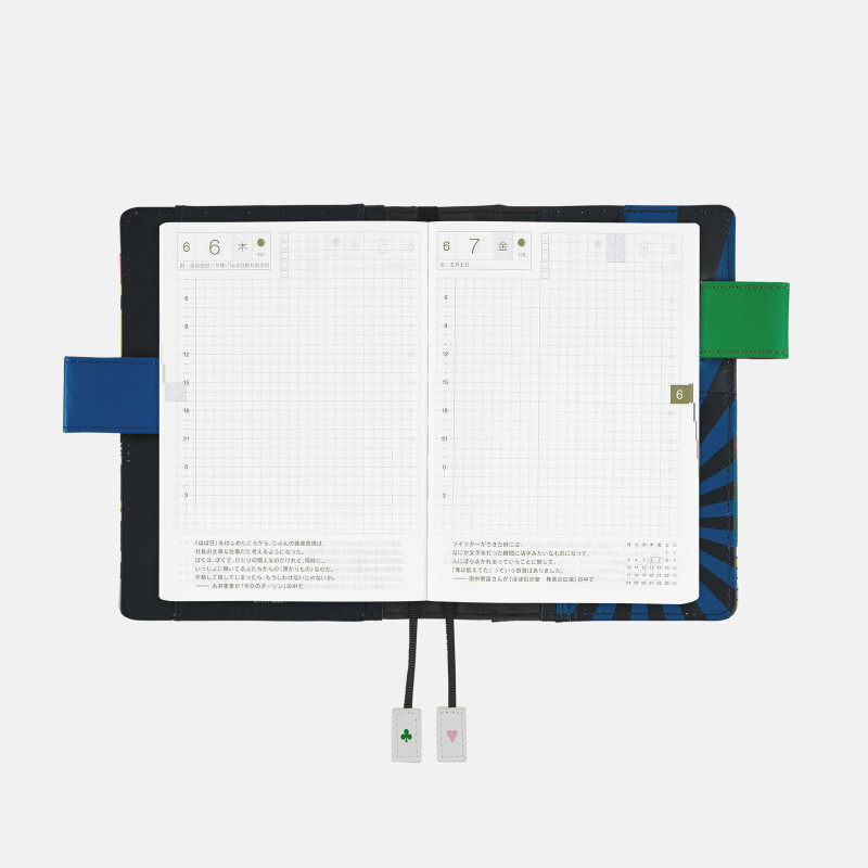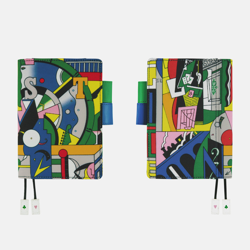 This cover features an artwork created by artist Tadanori Yokoo in 1978 as a kimono advertisement visual for Kyoho Co., Ltd. Originally purple and yellow in its color scheme, the piece has been redone in a green and blue tone to match the aesthetic of the Hobonichi Techo Original.
