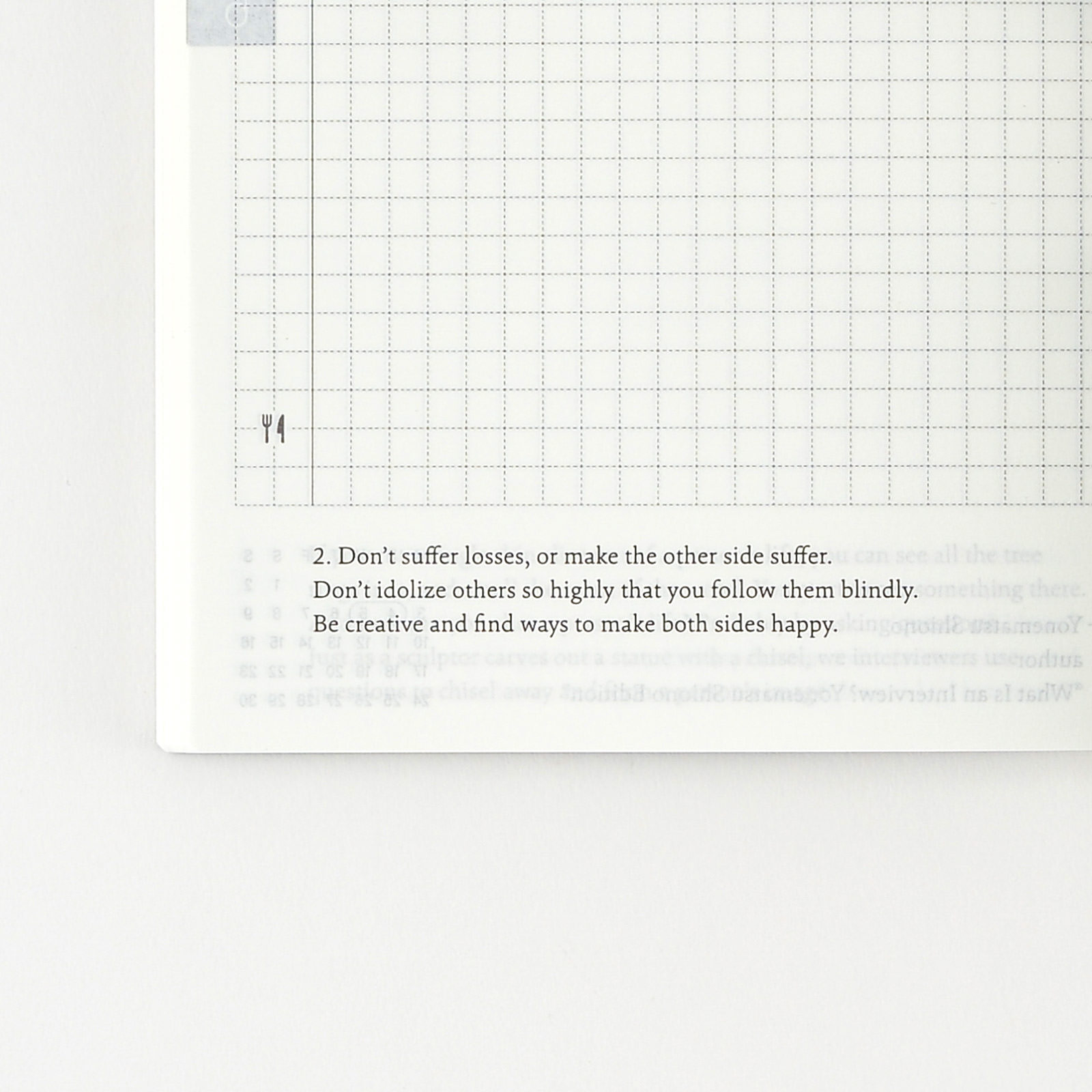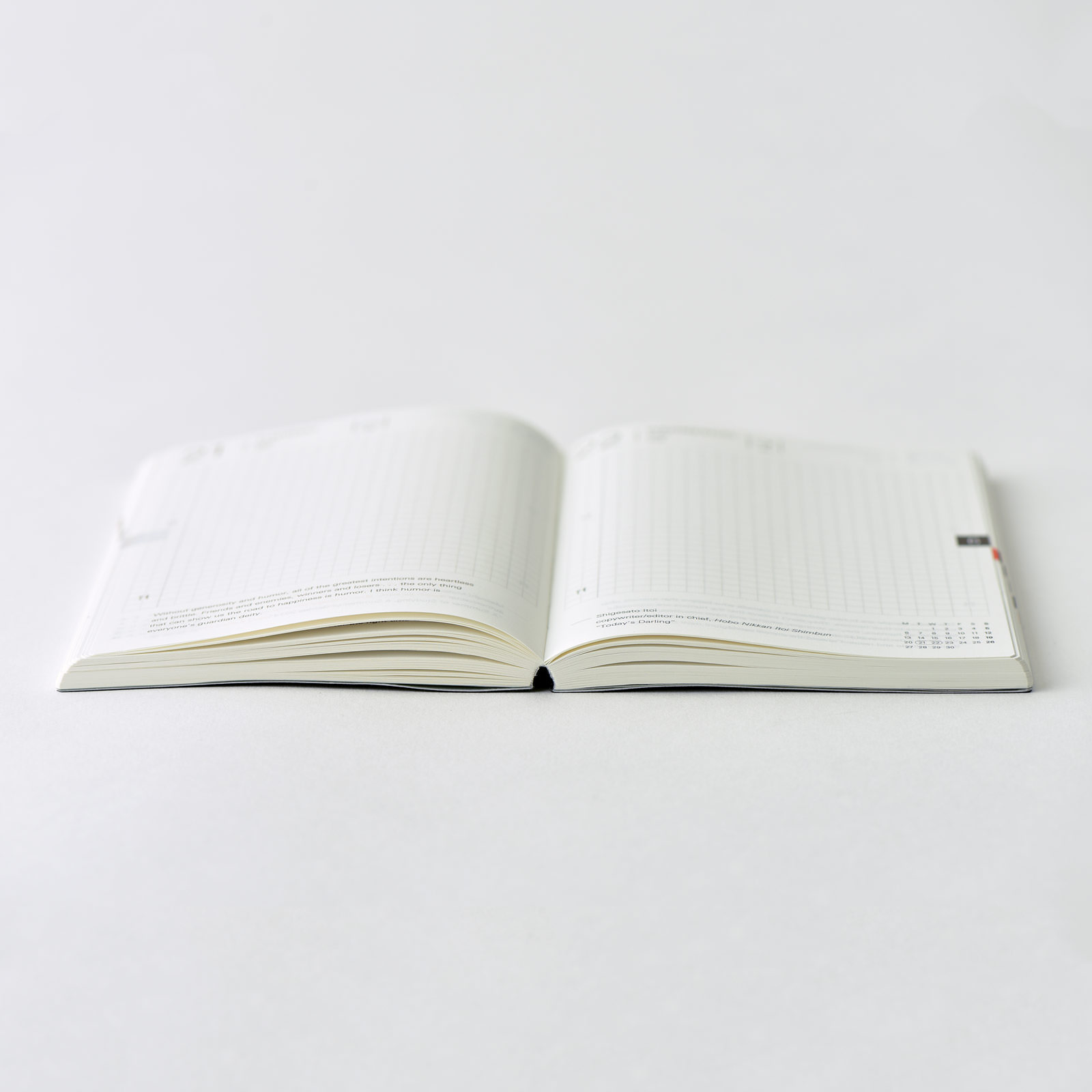 The graph paper in the English version is slightly enlarged to 4 mm to allow users to write comfortably in any language. Timelines are simplified to a single 12 to denote noon so users can completely customize it to their own schedule (or ignore it completely), and each day is also labeled with the number of the consecutive week that year, from 1 to 52.