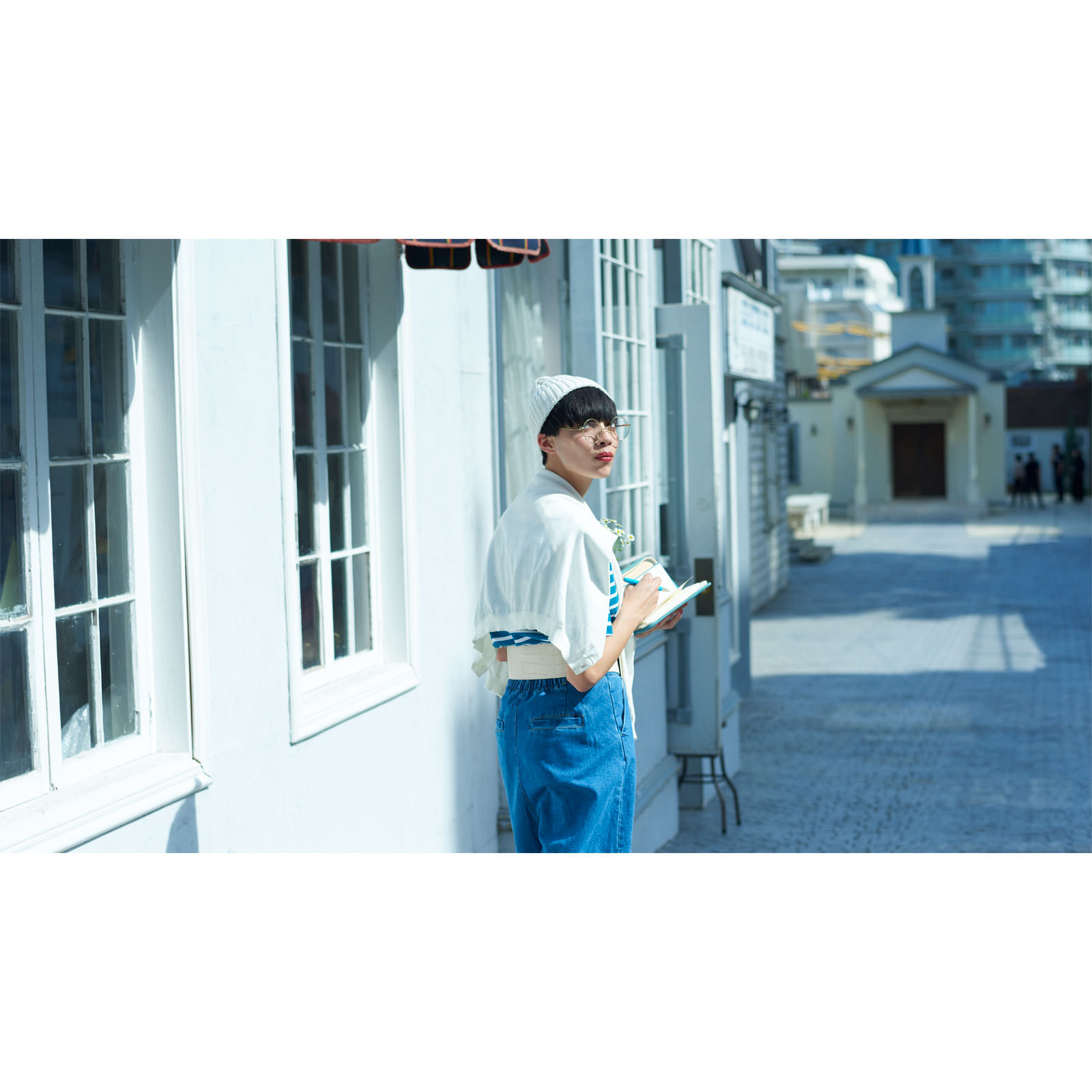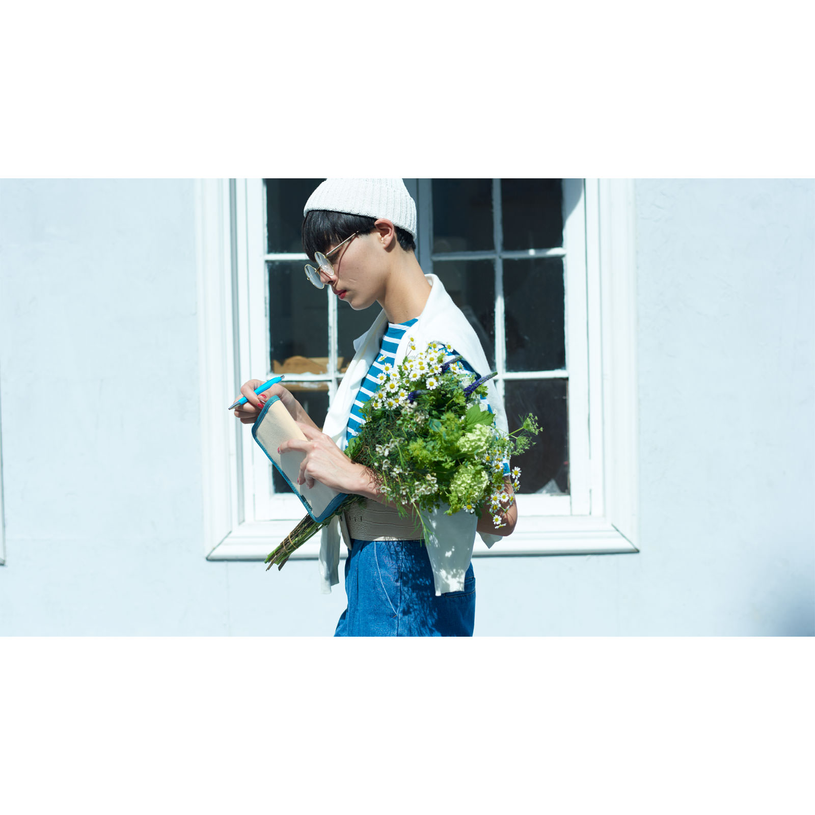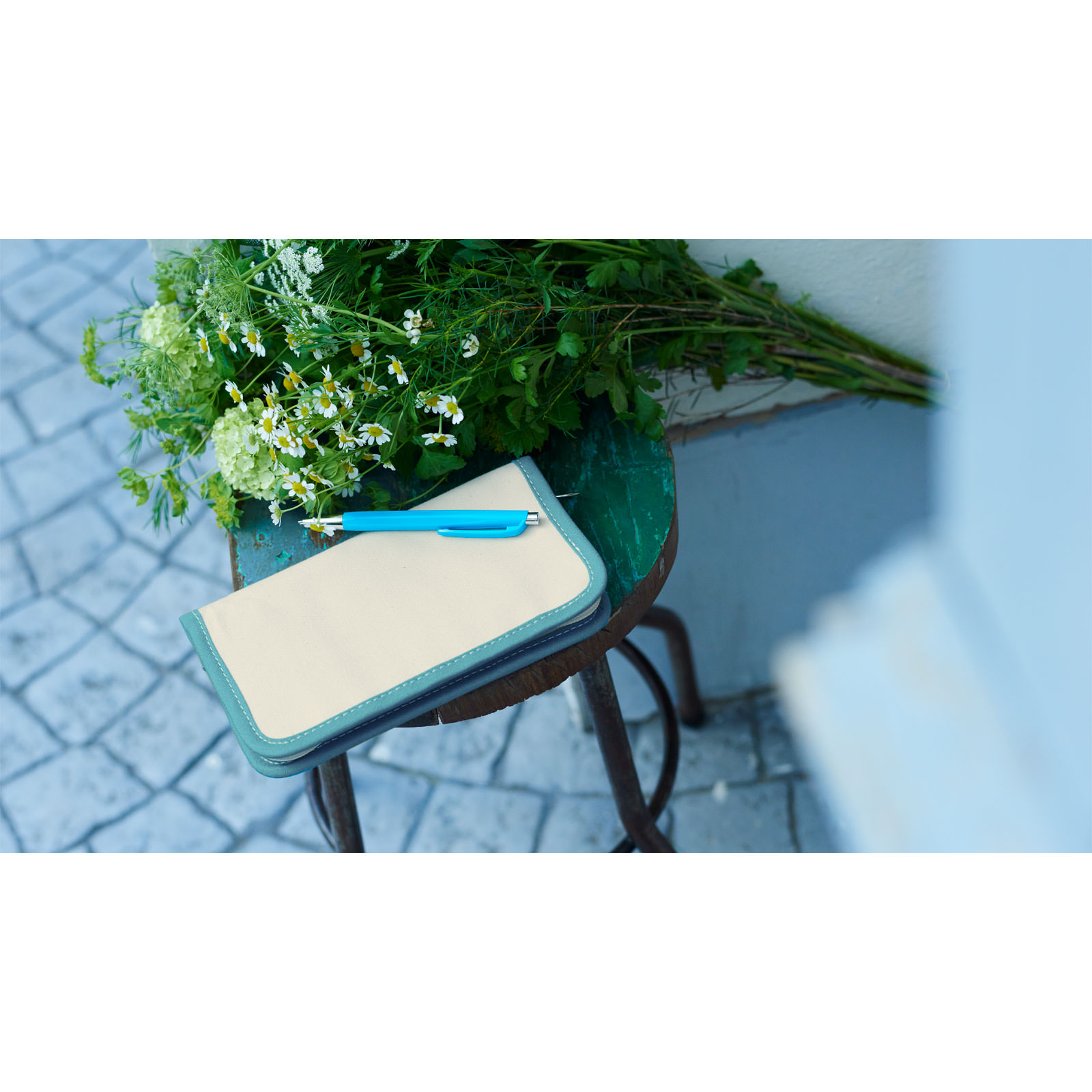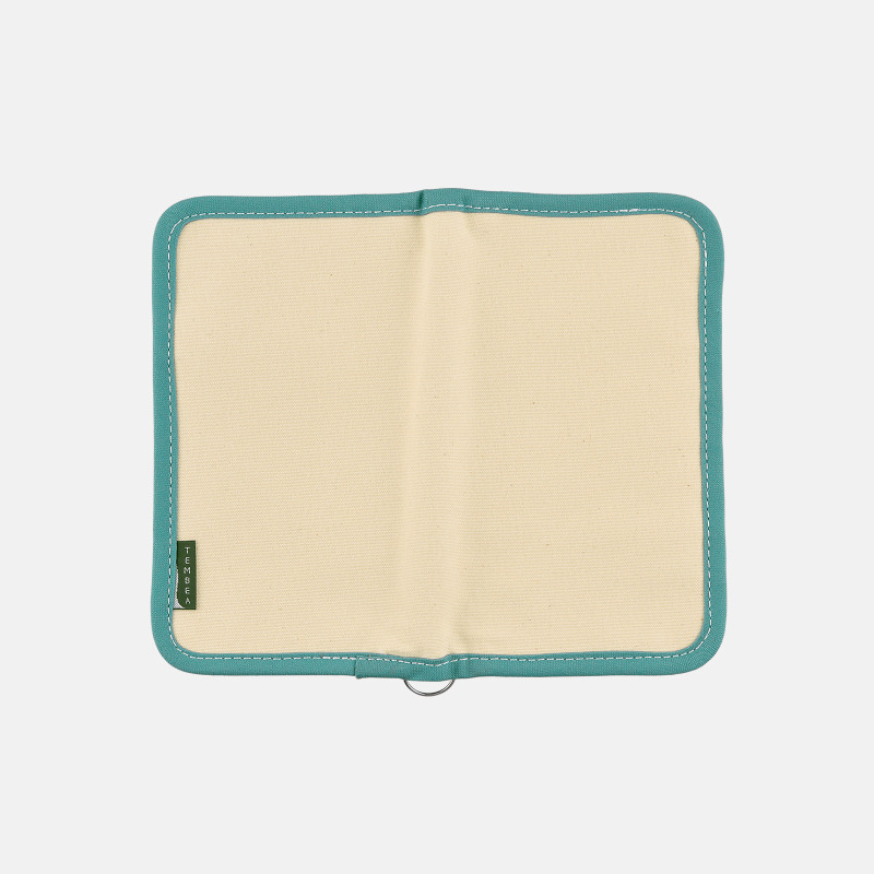 The coarse, off-white cotton canvas surface feels pleasant to the touch and is outlined with refreshing mint-blue piping. You can handle the cover as roughly as you would a sturdy tote bag, and never tire of its nice look as you carry it with you every day.