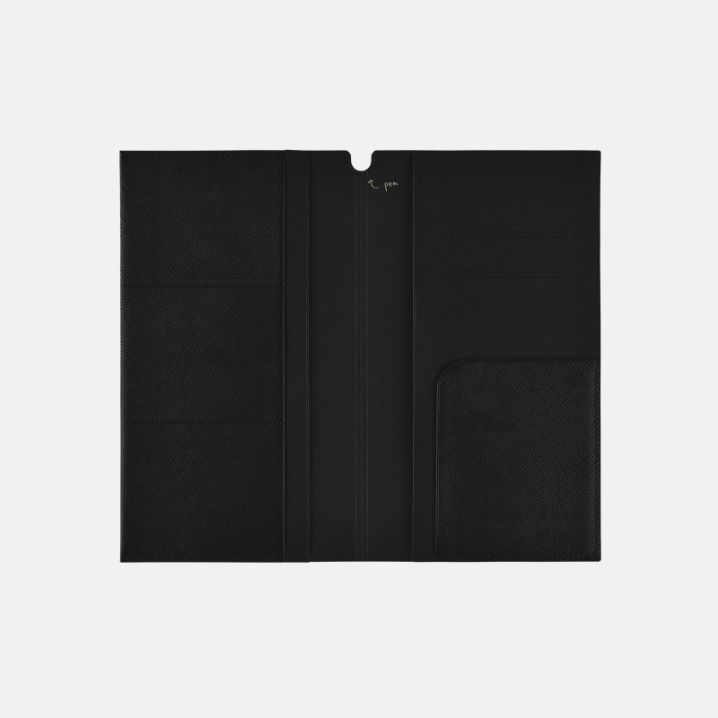 The classic black color scheme is consistent throughout the cover to give it a sophisticated look. The base of the interior is smooth leather, while the pockets contain the same texture as the exterior.