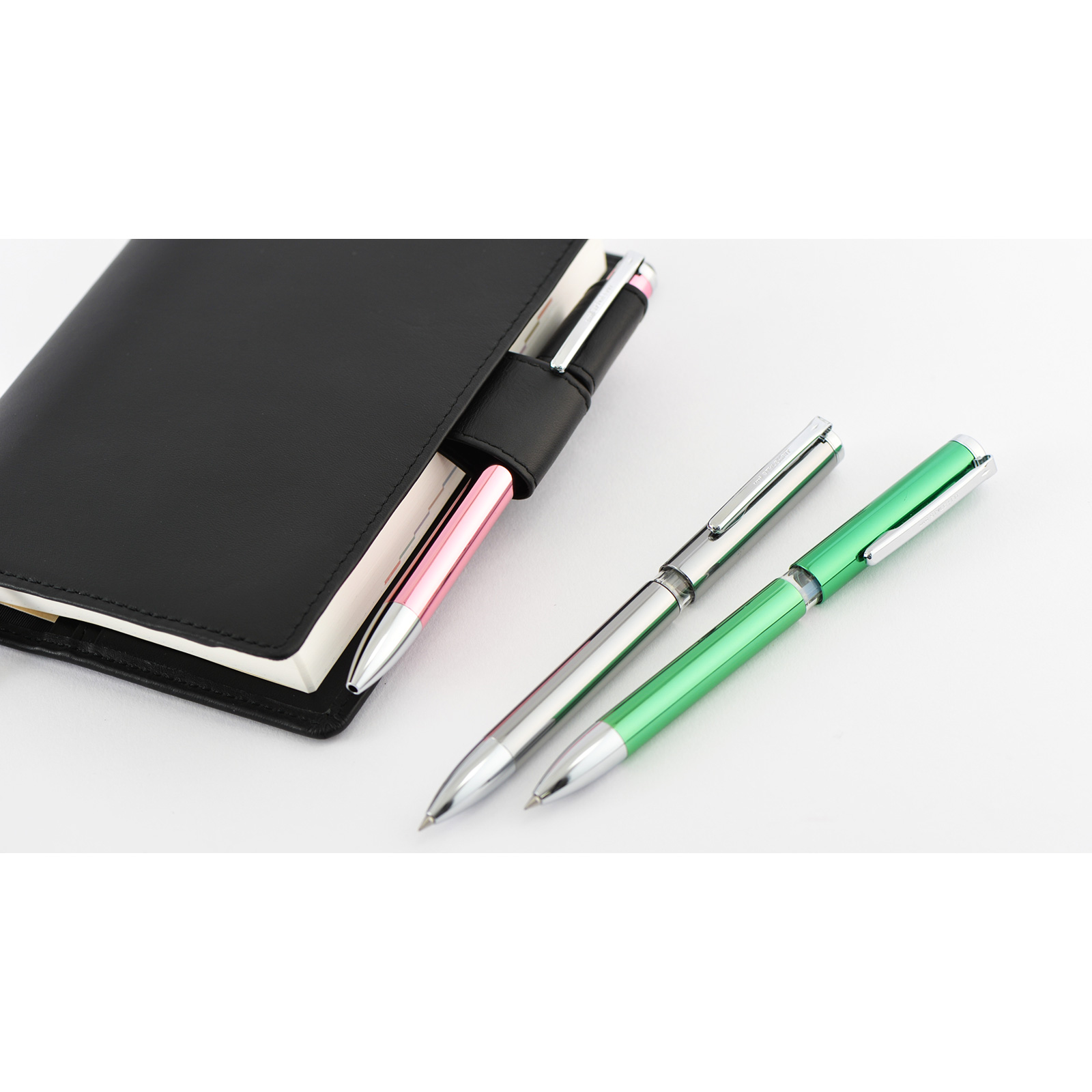 Style Fit MeisterThis retractable pen body component allows users to choose three ink refills of their choice and completely customize their pen. The pen body is a simple metal design that fits with any planner cover. Ink refills come in two varieties: the smooth, oil-based Jetstream 3-color 0.5 mm ballpoint ink in red, blue, and black, or the vibrant, water-based 5-color 0.38 mm Gel Ink set. The multicolor ink sets are designed to bring you a versatile pen that's also great for sketching.