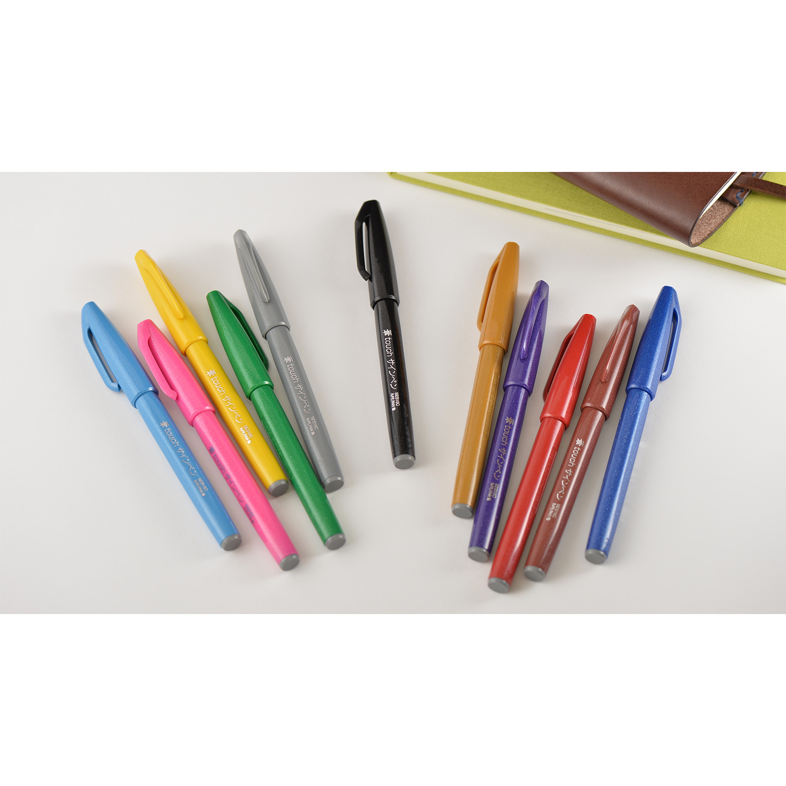 Brush-Touch Felt Tip PenThese water-based markers have brush tips for expressive writing. The bright colors of the aqueous dye ink won’t transfer even on the thin pages of the planner, and the ink dries relatively quickly. The brush tips provide a smooth writing experience great for writing or outlining illustrations with dynamic line thickness. The brush tips will start out somewhat firm, but will soften over continued use for a stronger “brush” feel.