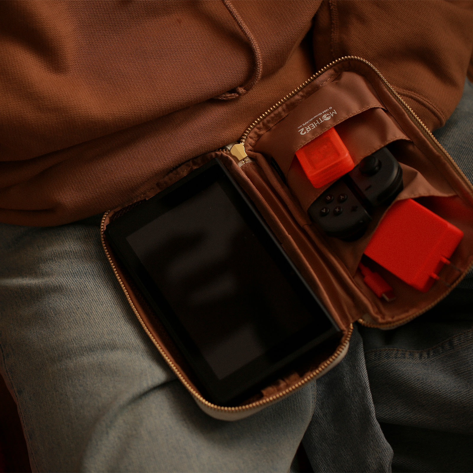Turn the pouch into a convenient video game carrying case by storing your handheld console and favorite games. The Nintendo Switch fits perfectly! (Pictured: Pixel Patterns)